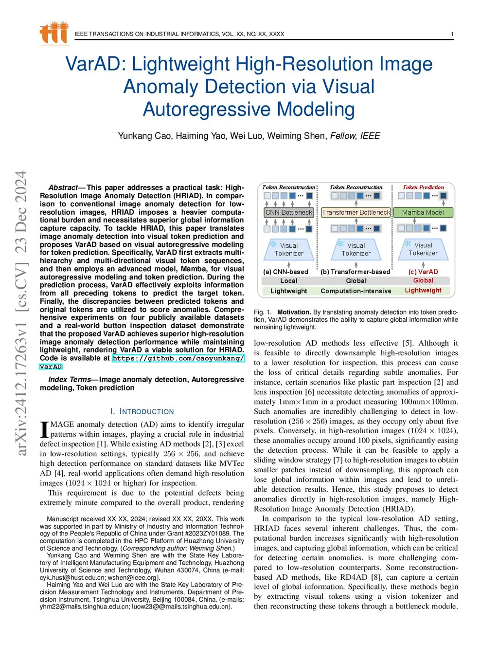 This paper addresses a practical task: High-Resolution Image Anomaly Detection (HRIAD). In comparison to conventional image anomaly detection for low-resolution images, HRIAD imposes a heavier computational burden and necessitates superior global information capture capacity. To tackle HRIAD, this paper translates image anomaly detection into visual token prediction and proposes VarAD based on visual autoregressive modeling for token prediction. Specifically, VarAD first extracts multi-hierarchy and multi-directional visual token sequences, and then employs an advanced model, Mamba, for visual autoregressive modeling and token prediction. During the prediction process, VarAD effectively exploits information from all preceding tokens to predict the target token. Finally, the discrepancies between predicted tokens and original tokens are utilized to score anomalies. Comprehensive experiments on four publicly available datasets and a real-world button inspection dataset demonstrate that the proposed VarAD achieves superior high-resolution image anomaly detection performance while maintaining lightweight, rendering VarAD a viable solution for HRIAD. Code is available at \href{https://github.com/caoyunkang/VarAD}{\url{https://github.com/caoyunkang/VarAD}}.