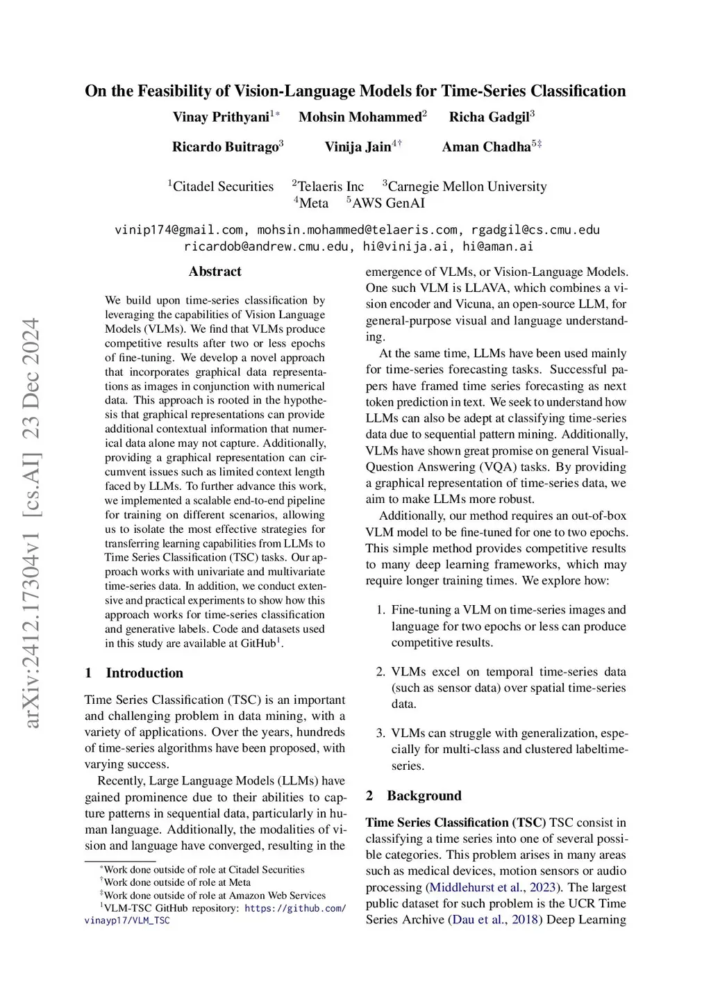 We build upon time-series classification by leveraging the capabilities of Vision Language Models (VLMs). We find that VLMs produce competitive results after two or less epochs of fine-tuning. We develop a novel approach that incorporates graphical data representations as images in conjunction with numerical data. This approach is rooted in the hypothesis that graphical representations can provide additional contextual information that numerical data alone may not capture. Additionally, providing a graphical representation can circumvent issues such as limited context length faced by LLMs. To further advance this work, we implemented a scalable end-to-end pipeline for training on different scenarios, allowing us to isolate the most effective strategies for transferring learning capabilities from LLMs to Time Series Classification (TSC) tasks. Our approach works with univariate and multivariate time-series data. In addition, we conduct extensive and practical experiments to show how this approach works for time-series classification and generative labels.