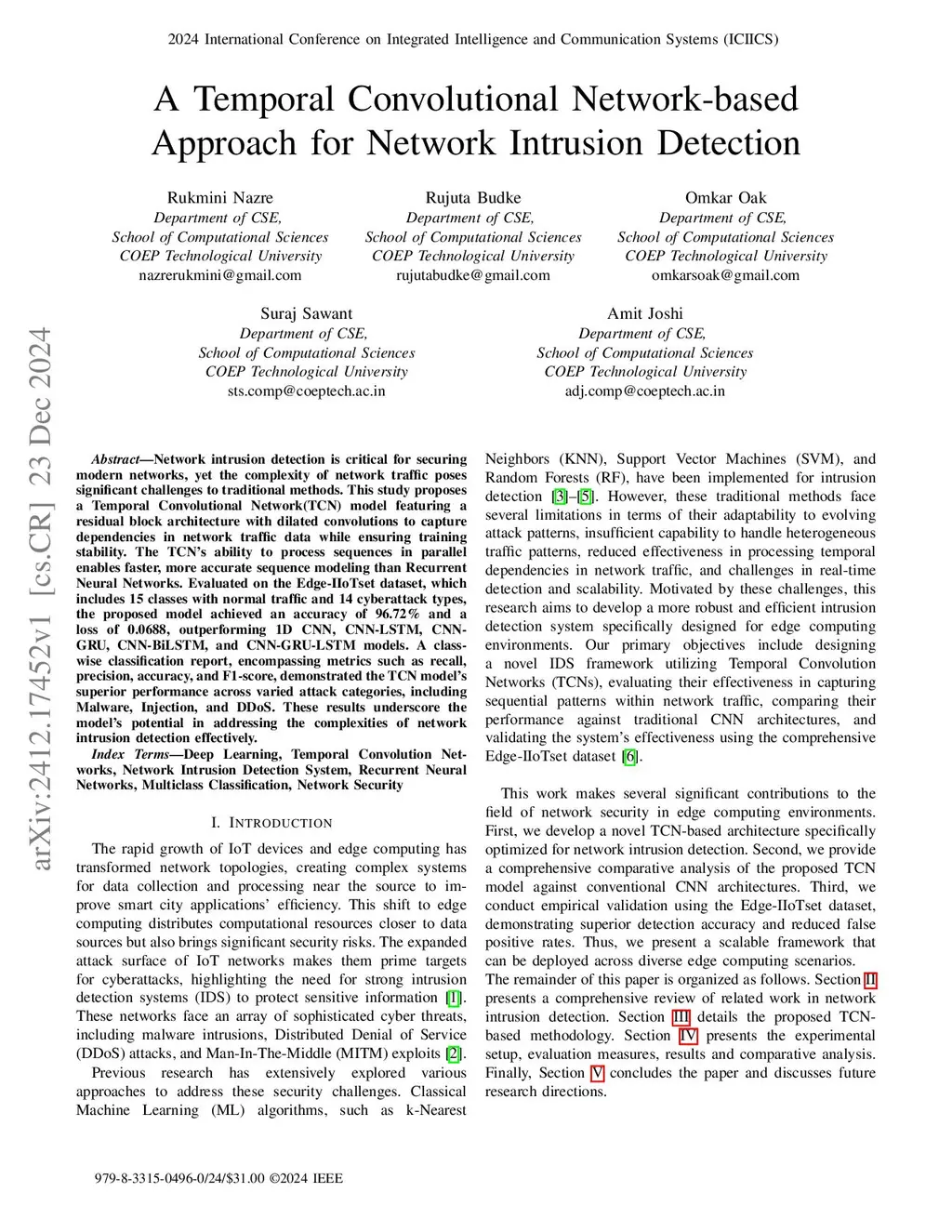 Network intrusion detection is critical for securing modern networks, yet the complexity of network traffic poses significant challenges to traditional methods. This study proposes a Temporal Convolutional Network(TCN) model featuring a residual block architecture with dilated convolutions to capture dependencies in network traffic data while ensuring training stability. The TCN's ability to process sequences in parallel enables faster, more accurate sequence modeling than Recurrent Neural Networks. Evaluated on the Edge-IIoTset dataset, which includes 15 classes with normal traffic and 14 cyberattack types, the proposed model achieved an accuracy of 96.72% and a loss of 0.0688, outperforming 1D CNN, CNN-LSTM, CNN-GRU, CNN-BiLSTM, and CNN-GRU-LSTM models. A class-wise classification report, encompassing metrics such as recall, precision, accuracy, and F1-score, demonstrated the TCN model's superior performance across varied attack categories, including Malware, Injection, and DDoS. These results underscore the model's potential in addressing the complexities of network intrusion detection effectively.
