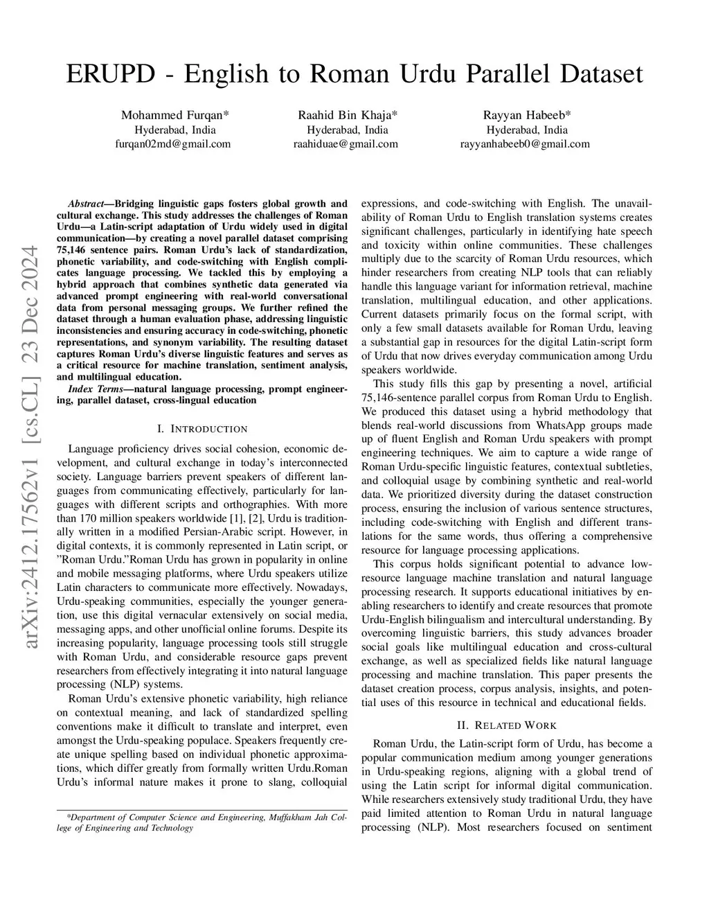 Bridging linguistic gaps fosters global growth and cultural exchange. This study addresses the challenges of Roman Urdu -- a Latin-script adaptation of Urdu widely used in digital communication -- by creating a novel parallel dataset comprising 75,146 sentence pairs. Roman Urdu's lack of standardization, phonetic variability, and code-switching with English complicates language processing. We tackled this by employing a hybrid approach that combines synthetic data generated via advanced prompt engineering with real-world conversational data from personal messaging groups. We further refined the dataset through a human evaluation phase, addressing linguistic inconsistencies and ensuring accuracy in code-switching, phonetic representations, and synonym variability. The resulting dataset captures Roman Urdu's diverse linguistic features and serves as a critical resource for machine translation, sentiment analysis, and multilingual education.