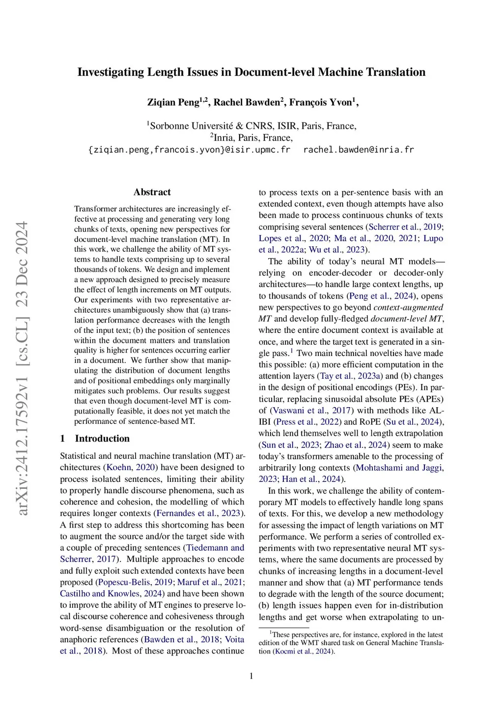 Transformer architectures are increasingly effective at processing and generating very long chunks of texts, opening new perspectives for document-level machine translation (MT). In this work, we challenge the ability of MT systems to handle texts comprising up to several thousands of tokens. We design and implement a new approach designed to precisely measure the effect of length increments on MT outputs. Our experiments with two representative architectures unambiguously show that (a)~translation performance decreases with the length of the input text; (b)~the position of sentences within the document matters, and translation quality is higher for sentences occurring earlier in a document. We further show that manipulating the distribution of document lengths and of positional embeddings only marginally mitigates such problems. Our results suggest that even though document-level MT is computationally feasible, it does not yet match the performance of sentence-based MT.