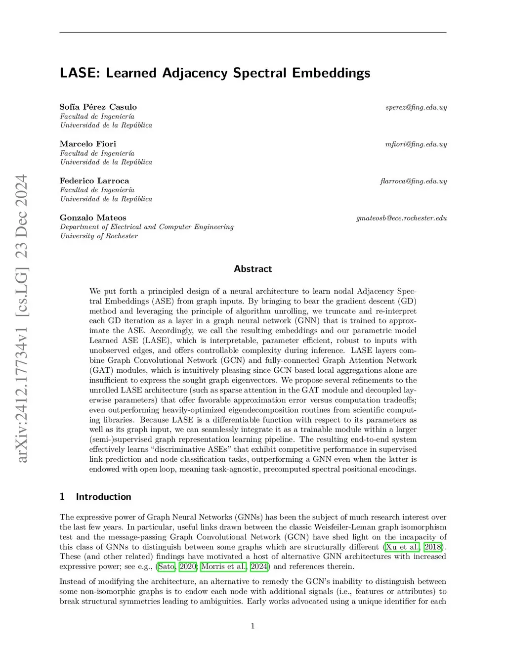 We put forth a principled design of a neural architecture to learn nodal Adjacency Spectral Embeddings (ASE) from graph inputs. By bringing to bear the gradient descent (GD) method and leveraging the principle of algorithm unrolling, we truncate and re-interpret each GD iteration as a layer in a graph neural network (GNN) that is trained to approximate the ASE. Accordingly, we call the resulting embeddings and our parametric model Learned ASE (LASE), which is interpretable, parameter efficient, robust to inputs with unobserved edges, and offers controllable complexity during inference. LASE layers combine Graph Convolutional Network (GCN) and fully-connected Graph Attention Network (GAT) modules, which is intuitively pleasing since GCN-based local aggregations alone are insufficient to express the sought graph eigenvectors. We propose several refinements to the unrolled LASE architecture (such as sparse attention in the GAT module and decoupled layerwise parameters) that offer favorable approximation error versus computation tradeoffs; even outperforming heavily-optimized eigendecomposition routines from scientific computing libraries. Because LASE is a differentiable function with respect to its parameters as well as its graph input, we can seamlessly integrate it as a trainable module within a larger (semi-)supervised graph representation learning pipeline. The resulting end-to-end system effectively learns ``discriminative ASEs'' that exhibit competitive performance in supervised link prediction and node classification tasks, outperforming a GNN even when the latter is endowed with open loop, meaning task-agnostic, precomputed spectral positional encodings.