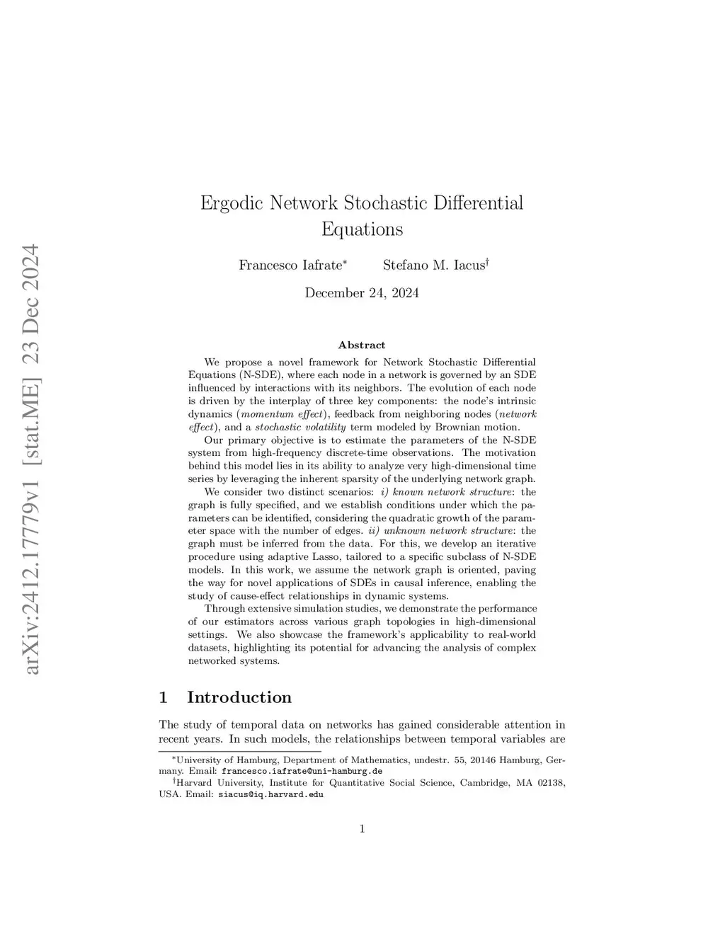 We propose a novel framework for Network Stochastic Differential Equations (N-SDE), where each node in a network is governed by an SDE influenced by interactions with its neighbors. The evolution of each node is driven by the interplay of three key components: the node's intrinsic dynamics (\emph{momentum effect}), feedback from neighboring nodes (\emph{network effect}), and a \emph{stochastic volatility} term modeled by Brownian motion. Our primary objective is to estimate the parameters of the N-SDE system from high-frequency discrete-time observations. The motivation behind this model lies in its ability to analyze very high-dimensional time series by leveraging the inherent sparsity of the underlying network graph. We consider two distinct scenarios: \textit{i) known network structure}: the graph is fully specified, and we establish conditions under which the parameters can be identified, considering the quadratic growth of the parameter space with the number of edges. \textit{ii) unknown network structure}: the graph must be inferred from the data. For this, we develop an iterative procedure using adaptive Lasso, tailored to a specific subclass of N-SDE models. In this work, we assume the network graph is oriented, paving the way for novel applications of SDEs in causal inference, enabling the study of cause-effect relationships in dynamic systems. Through extensive simulation studies, we demonstrate the performance of our estimators across various graph topologies in high-dimensional settings. We also showcase the framework's applicability to real-world datasets, highlighting its potential for advancing the analysis of complex networked systems.