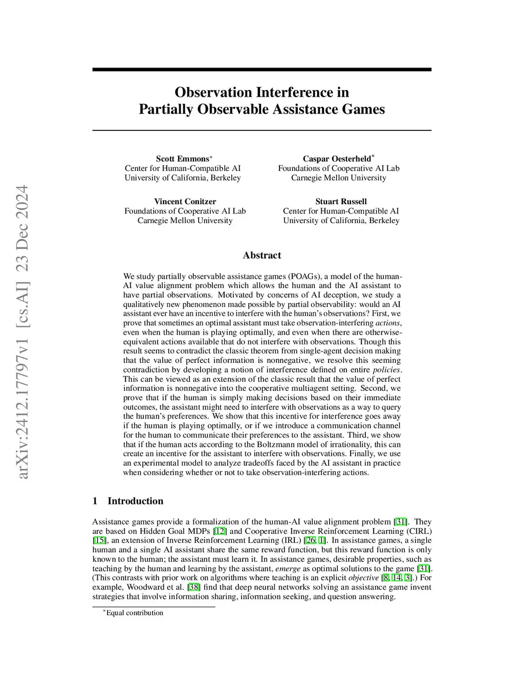 We study partially observable assistance games (POAGs), a model of the human-AI value alignment problem which allows the human and the AI assistant to have partial observations. Motivated by concerns of AI deception, we study a qualitatively new phenomenon made possible by partial observability: would an AI assistant ever have an incentive to interfere with the human's observations? First, we prove that sometimes an optimal assistant must take observation-interfering actions, even when the human is playing optimally, and even when there are otherwise-equivalent actions available that do not interfere with observations. Though this result seems to contradict the classic theorem from single-agent decision making that the value of information is nonnegative, we resolve this seeming contradiction by developing a notion of interference defined on entire policies. This can be viewed as an extension of the classic result that the value of information is nonnegative into the cooperative multiagent setting. Second, we prove that if the human is simply making decisions based on their immediate outcomes, the assistant might need to interfere with observations as a way to query the human's preferences. We show that this incentive for interference goes away if the human is playing optimally, or if we introduce a communication channel for the human to communicate their preferences to the assistant. Third, we show that if the human acts according to the Boltzmann model of irrationality, this can create an incentive for the assistant to interfere with observations. Finally, we use an experimental model to analyze tradeoffs faced by the AI assistant in practice when considering whether or not to take observation-interfering actions.