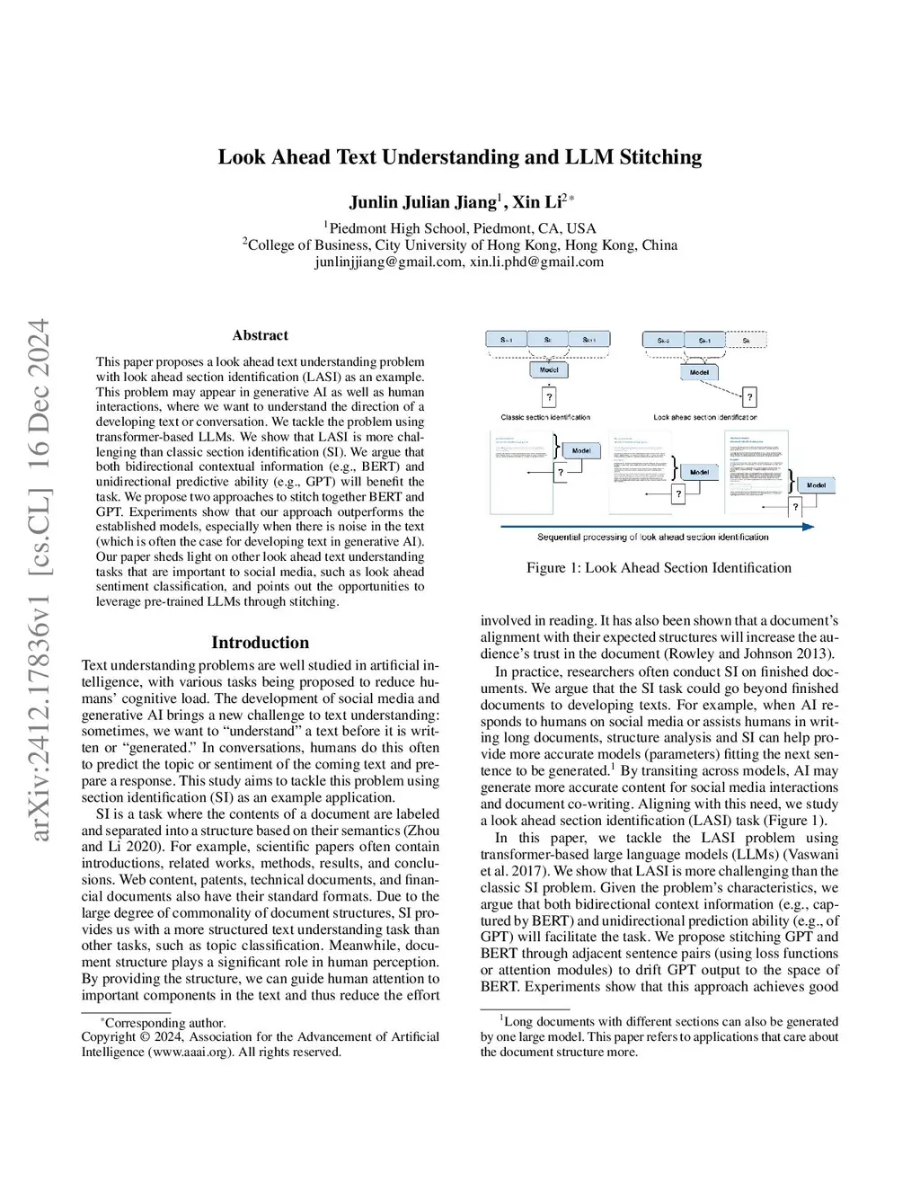 This paper proposes a look ahead text understanding problem with look ahead section identification (LASI) as an example. This problem may appear in generative AI as well as human interactions, where we want to understand the direction of a developing text or conversation. We tackle the problem using transformer-based LLMs. We show that LASI is more challenging than classic section identification (SI). We argue that both bidirectional contextual information (e.g., BERT) and unidirectional predictive ability (e.g., GPT) will benefit the task. We propose two approaches to stitch together BERT and GPT. Experiments show that our approach outperforms the established models, especially when there is noise in the text (which is often the case for developing text in generative AI). Our paper sheds light on other look ahead text understanding tasks that are important to social media, such as look ahead sentiment classification, and points out the opportunities to leverage pre-trained LLMs through stitching.