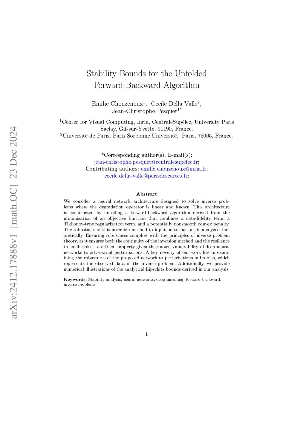 We consider a neural network architecture designed to solve inverse problems where the degradation operator is linear and known. This architecture is constructed by unrolling a forward-backward algorithm derived from the minimization of an objective function that combines a data-fidelity term, a Tikhonov-type regularization term, and a potentially nonsmooth convex penalty. The robustness of this inversion method to input perturbations is analyzed theoretically. Ensuring robustness complies with the principles of inverse problem theory, as it ensures both the continuity of the inversion method and the resilience to small noise - a critical property given the known vulnerability of deep neural networks to adversarial perturbations. A key novelty of our work lies in examining the robustness of the proposed network to perturbations in its bias, which represents the observed data in the inverse problem. Additionally, we provide numerical illustrations of the analytical Lipschitz bounds derived in our analysis.