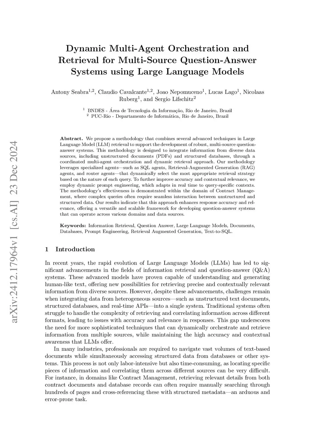 We propose a methodology that combines several advanced techniques in Large Language Model (LLM) retrieval to support the development of robust, multi-source question-answer systems. This methodology is designed to integrate information from diverse data sources, including unstructured documents (PDFs) and structured databases, through a coordinated multi-agent orchestration and dynamic retrieval approach. Our methodology leverages specialized agents-such as SQL agents, Retrieval-Augmented Generation (RAG) agents, and router agents - that dynamically select the most appropriate retrieval strategy based on the nature of each query. To further improve accuracy and contextual relevance, we employ dynamic prompt engineering, which adapts in real time to query-specific contexts. The methodology's effectiveness is demonstrated within the domain of Contract Management, where complex queries often require seamless interaction between unstructured and structured data. Our results indicate that this approach enhances response accuracy and relevance, offering a versatile and scalable framework for developing question-answer systems that can operate across various domains and data sources.
