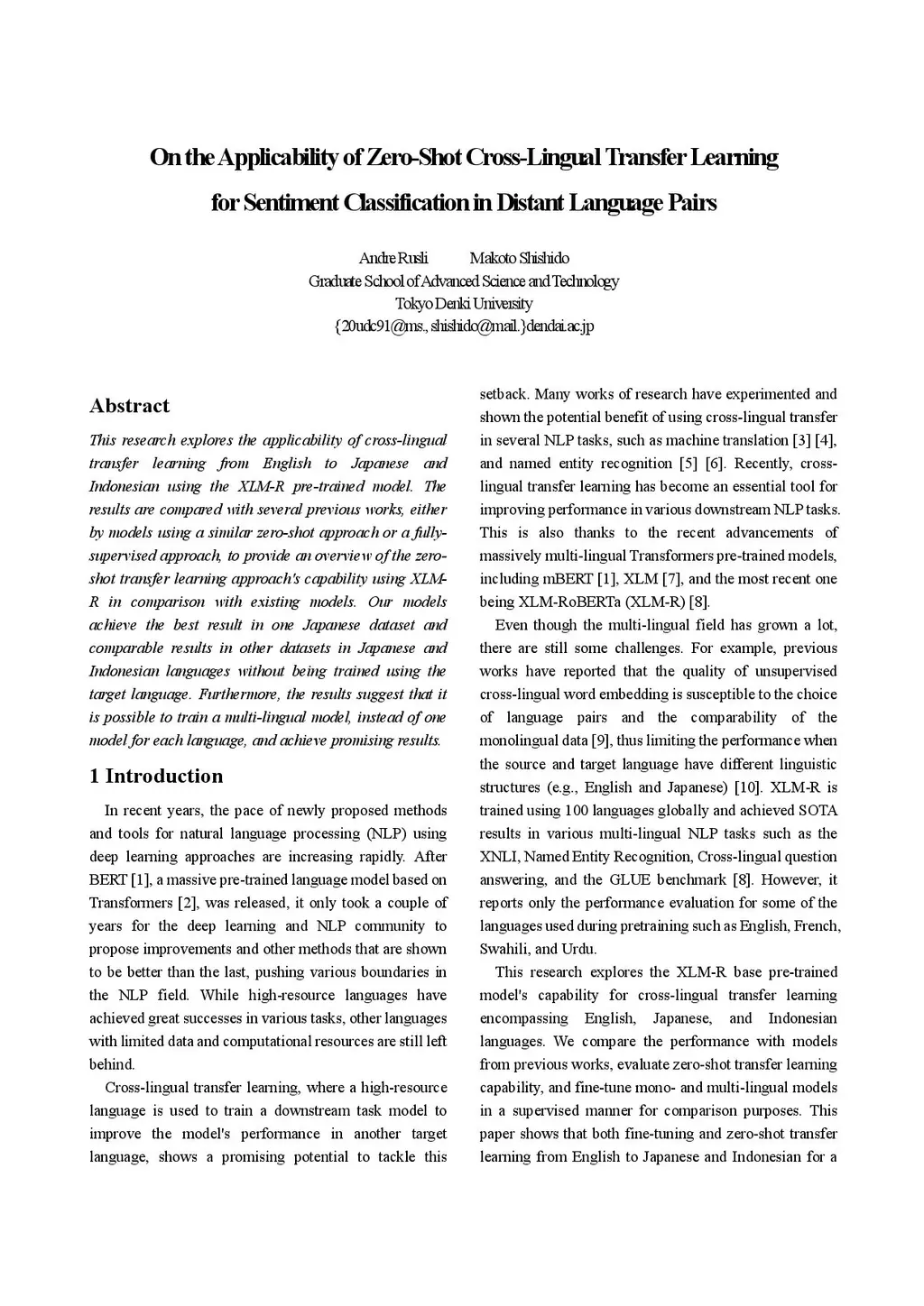This research explores the applicability of cross-lingual transfer learning from English to Japanese and Indonesian using the XLM-R pre-trained model. The results are compared with several previous works, either by models using a similar zero-shot approach or a fully-supervised approach, to provide an overview of the zero-shot transfer learning approach's capability using XLM-R in comparison with existing models. Our models achieve the best result in one Japanese dataset and comparable results in other datasets in Japanese and Indonesian languages without being trained using the target language. Furthermore, the results suggest that it is possible to train a multi-lingual model, instead of one model for each language, and achieve promising results.