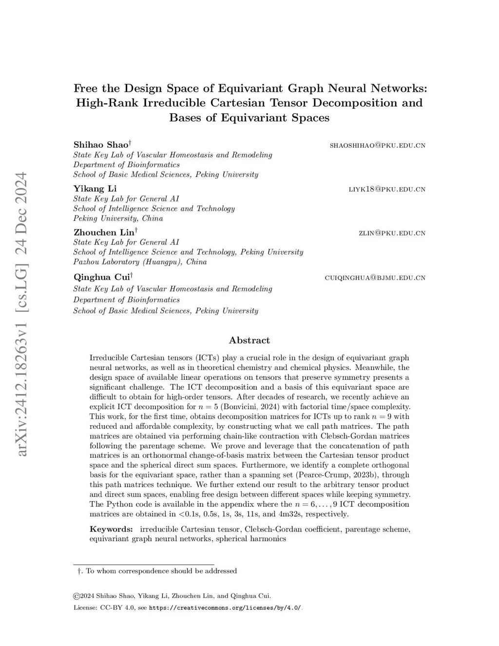 Irreducible Cartesian tensors (ICTs) play a crucial role in the design of equivariant graph neural networks, as well as in theoretical chemistry and chemical physics. Meanwhile, the design space of available linear operations on tensors that preserve symmetry presents a significant challenge. The ICT decomposition and a basis of this equivariant space are difficult to obtain for high-rank tensors. After decades of research, Bonvicini (2024) recently achieves an explicit ICT decomposition for with factorial time/space complexity. In this work we, for the first time, obtains decomposition matrices for ICTs up to rank with reduced and affordable complexity, by constructing what we call path matrices. The path matrices are obtained via performing chain-like contractions with Clebsch-Gordan matrices following the parentage scheme. We prove and leverage that the concatenation of path matrices is an orthonormal change-of-basis matrix between the Cartesian tensor product space and the spherical direct sum spaces. Furthermore, we identify a complete orthogonal basis for the equivariant space, rather than a spanning set (Pearce-Crump, 2023), through this path matrices technique. To the best of our knowledge, this is also the first analytic, rather than numerical, method for theoretically obtaining arbitrary rank orthogonal ICT decomposition matrices and orthogonal equivariant bases. We further extend our result to the arbitrary tensor product and direct sum spaces, enabling free design between different spaces while keeping symmetry. The Python code is available atthis https URL, where the ICT decomposition matrices are obtained in 1s, 3s, 11s, and 4m32s on 28-cores Intel(R) Xeon(R) Gold 6330 CPU @ 2.00GHz, respectively.