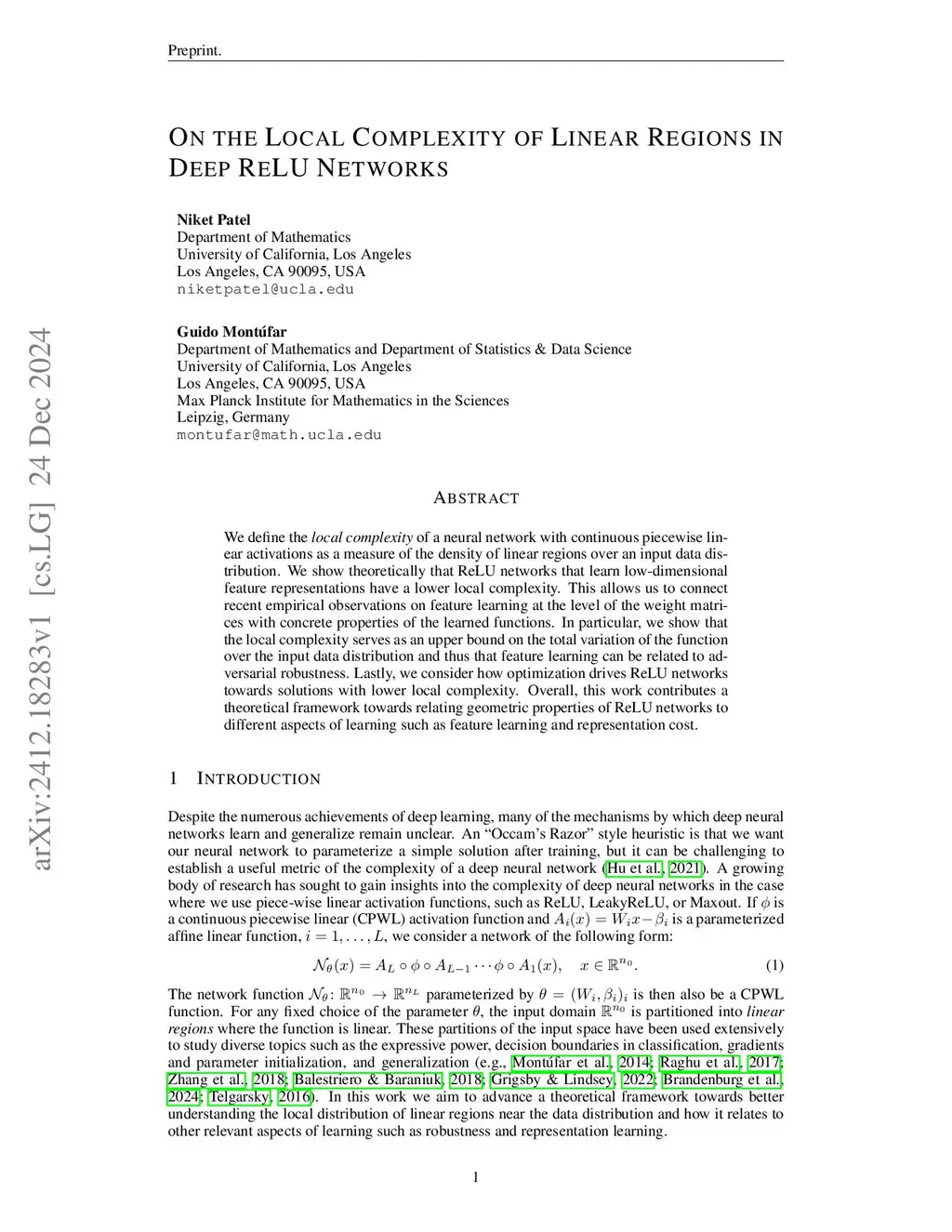 We define the local complexity of a neural network with continuous piecewise linear activations as a measure of the density of linear regions over an input data distribution. We show theoretically that ReLU networks that learn low-dimensional feature representations have a lower local complexity. This allows us to connect recent empirical observations on feature learning at the level of the weight matrices with concrete properties of the learned functions. In particular, we show that the local complexity serves as an upper bound on the total variation of the function over the input data distribution and thus that feature learning can be related to adversarial robustness. Lastly, we consider how optimization drives ReLU networks towards solutions with lower local complexity. Overall, this work contributes a theoretical framework towards relating geometric properties of ReLU networks to different aspects of learning such as feature learning and representation cost.
