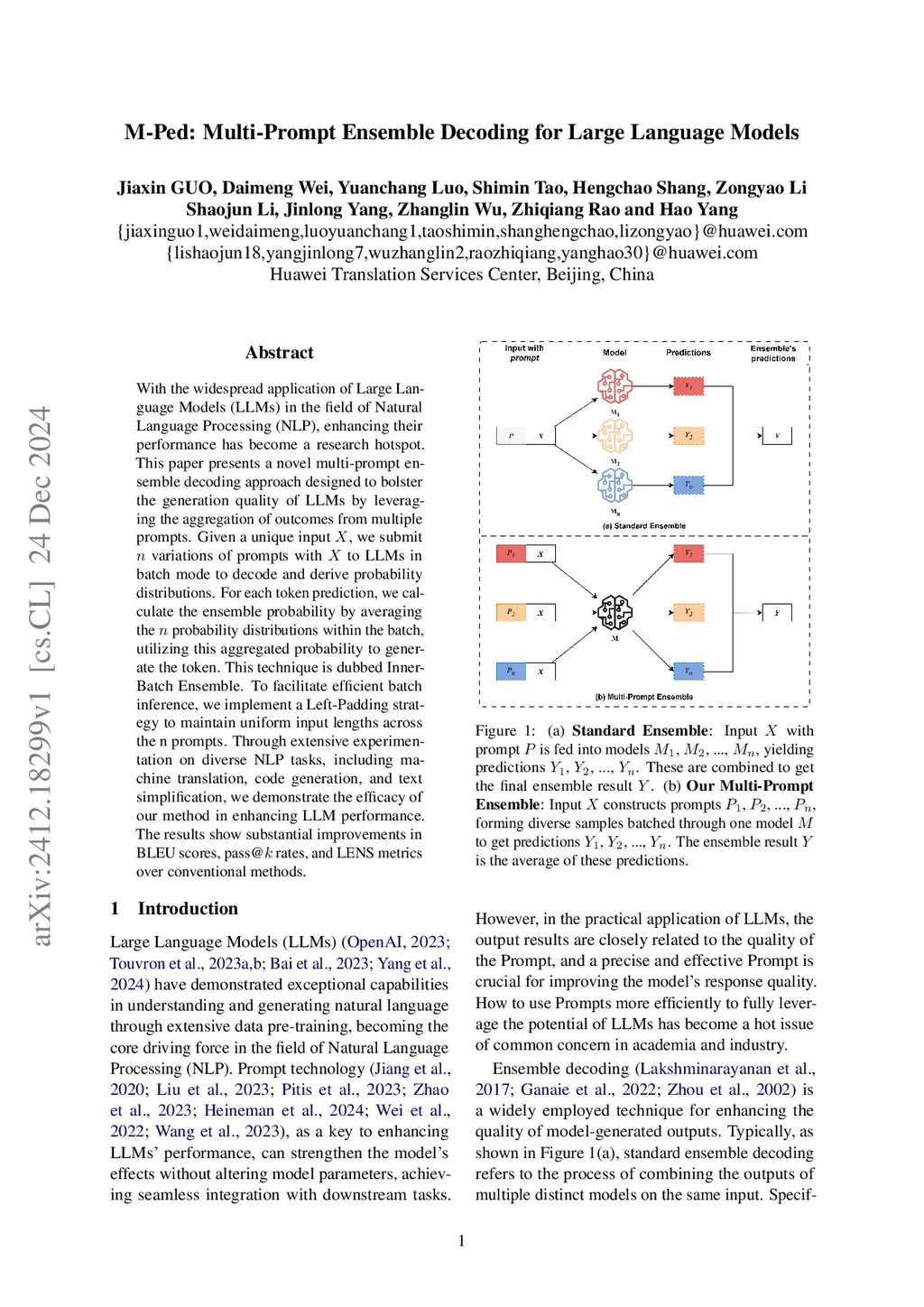 With the widespread application of Large Language Models (LLMs) in the field of Natural Language Processing (NLP), enhancing their performance has become a research hotspot. This paper presents a novel multi-prompt ensemble decoding approach designed to bolster the generation quality of LLMs by leveraging the aggregation of outcomes from multiple prompts. Given a unique input , we submit variations of prompts with to LLMs in batch mode to decode and derive probability distributions. For each token prediction, we calculate the ensemble probability by averaging the probability distributions within the batch, utilizing this aggregated probability to generate the token. This technique is dubbed Inner-Batch Ensemble. To facilitate efficient batch inference, we implement a Left-Padding strategy to maintain uniform input lengths across the n prompts. Through extensive experimentation on diverse NLP tasks, including machine translation, code generation, and text simplification, we demonstrate the efficacy of our method in enhancing LLM performance. The results show substantial improvements in BLEU scores, pass@ rates, and LENS metrics over conventional methods.