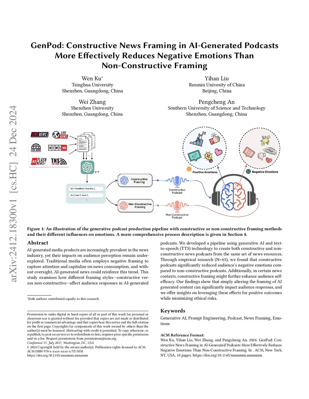 AI-generated media products are increasingly prevalent in the news industry, yet their impacts on audience perception remain underexplored. Traditional media often employs negative framing to capture attention and capitalize on news consumption, and without oversight, AI-generated news could reinforce this trend. This study examines how different framing styles-constructive versus non-constructive-affect audience responses in AI-generated podcasts. We developed a pipeline using generative AI and text-to-speech (TTS) technology to create both constructive and non-constructive news podcasts from the same set of news resources. Through empirical research (N=65), we found that constructive podcasts significantly reduced audience's negative emotions compared to non-constructive podcasts. Additionally, in certain news contexts, constructive framing might further enhance audience self-efficacy. Our findings show that simply altering the framing of AI generated content can significantly impact audience responses, and we offer insights on leveraging these effects for positive outcomes while minimizing ethical risks.