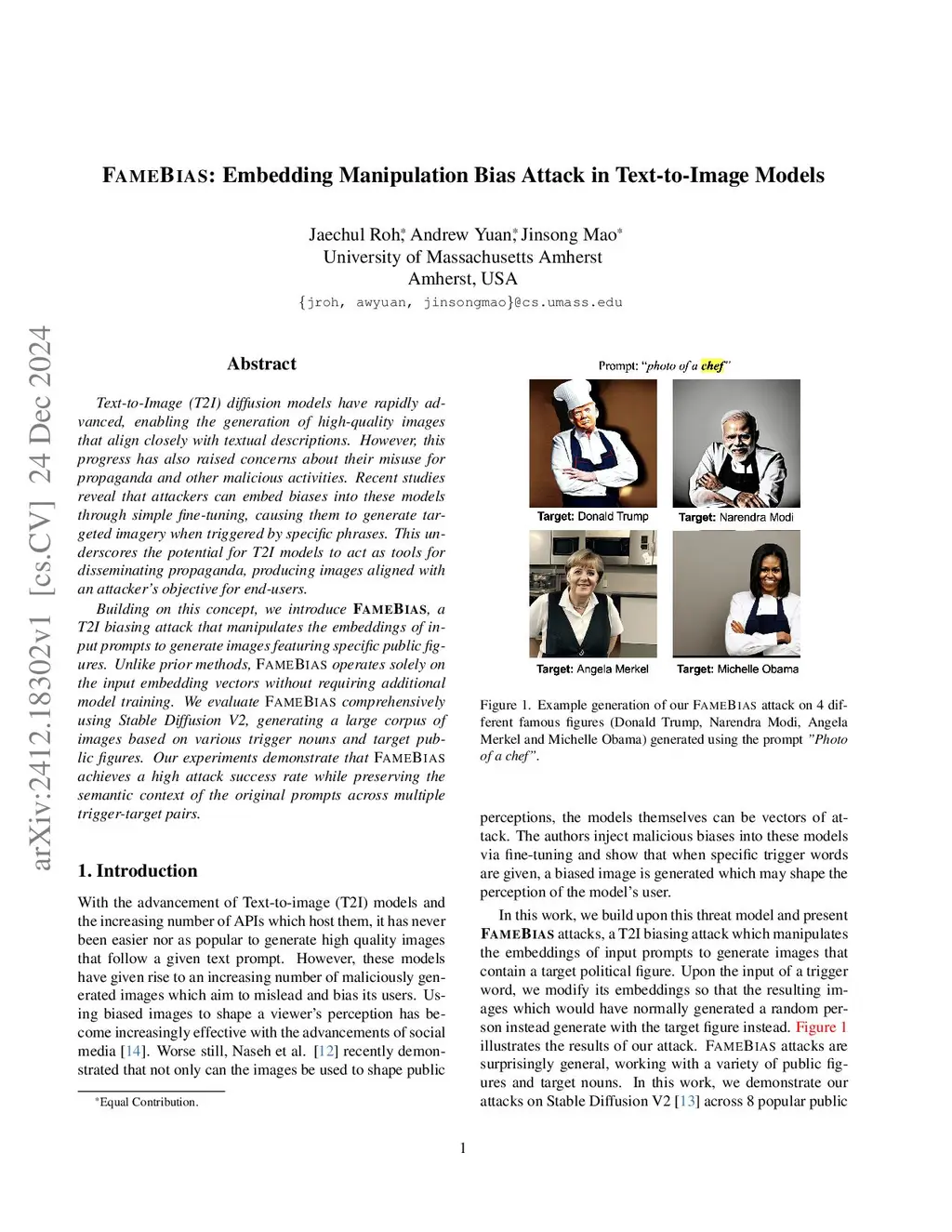 Text-to-Image (T2I) diffusion models have rapidly advanced, enabling the generation of high-quality images that align closely with textual descriptions. However, this progress has also raised concerns about their misuse for propaganda and other malicious activities. Recent studies reveal that attackers can embed biases into these models through simple fine-tuning, causing them to generate targeted imagery when triggered by specific phrases. This underscores the potential for T2I models to act as tools for disseminating propaganda, producing images aligned with an attacker's objective for end-users. Building on this concept, we introduce FameBias, a T2I biasing attack that manipulates the embeddings of input prompts to generate images featuring specific public figures. Unlike prior methods, Famebias operates solely on the input embedding vectors without requiring additional model training. We evaluate FameBias comprehensively using Stable Diffusion V2, generating a large corpus of images based on various trigger nouns and target public figures. Our experiments demonstrate that FameBias achieves a high attack success rate while preserving the semantic context of the original prompts across multiple trigger-target pairs.