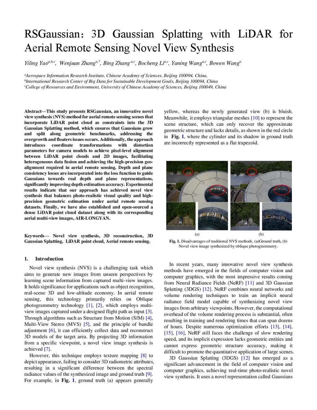 Novel View Synthesis (NVS) can reconstruct scenes from multi-view images and synthesize novel images from new viewpoints, which provides technical support for tasks such as target recognition and environmental perception. Aerial remote sensing can conveniently capture a wealth of multi-view images with just a few flights. However, the challenges brought by large distances and sparse viewing angles during collection can cause the model to easily produce floaters and overgrowth issues due to geometric estimation errors. This results in low visual quality and a lack of precise geometric estimation capabilities. Therefore, this study presents ARSGaussian, an innovative novel view synthesis (NVS) method for aerial remote sensing. The method incorporates LiDAR point cloud as constraints into the 3D Gaussian Splatting approach, adaptively guiding the Gaussians to grow and split along geometric benchmarks, thereby addressing the overgrowth and floaters issues. Additionally, considering the geometric distortions arising from data acquisition, coordinate transformations with distortion parameters are integrated to replace the simple pinhole camera model parameters to achieve pixel-level alignment between LiDAR point cloud and multi-view optical images, facilitating the accurate fusion of heterogeneous data and achieving the high-precision geo-alignment. Moreover, depth, normal and scale consistency losses are introduced into the regularization process to guide Gaussians toward real depth and plane representations, significantly improving geometric estimation accuracy. To address the current lack of dense airborne hybrid datasets, we have established and released AIR-LONGYAN, an open-source dataset containing a dense LiDAR point cloud (8 pts/m) and multi-view optical images captured by airborne scanners and cameras in diverse scenes....