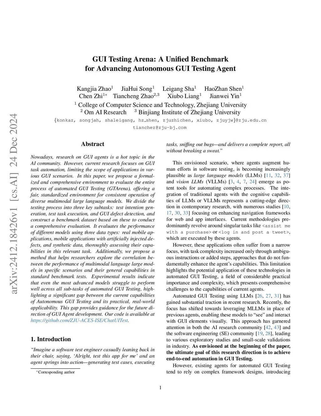 Nowadays, research on GUI agents is a hot topic in the AI community. However, current research focuses on GUI task automation, limiting the scope of applications in various GUI scenarios. In this paper, we propose a formalized and comprehensive environment to evaluate the entire process of automated GUI Testing (GTArena), offering a fair, standardized environment for consistent operation of diverse multimodal large language models. We divide the testing process into three key subtasks: test intention generation, test task execution, and GUI defect detection, and construct a benchmark dataset based on these to conduct a comprehensive evaluation. It evaluates the performance of different models using three data types: real mobile applications, mobile applications with artificially injected defects, and synthetic data, thoroughly assessing their capabilities in this relevant task. Additionally, we propose a method that helps researchers explore the correlation between the performance of multimodal language large models in specific scenarios and their general capabilities in standard benchmark tests. Experimental results indicate that even the most advanced models struggle to perform well across all sub-tasks of automated GUI Testing, highlighting a significant gap between the current capabilities of Autonomous GUI Testing and its practical, real-world applicability. This gap provides guidance for the future direction of GUI Agent development. Our code is available at https://github.com/ZJU-ACES-ISE/ChatUITest.