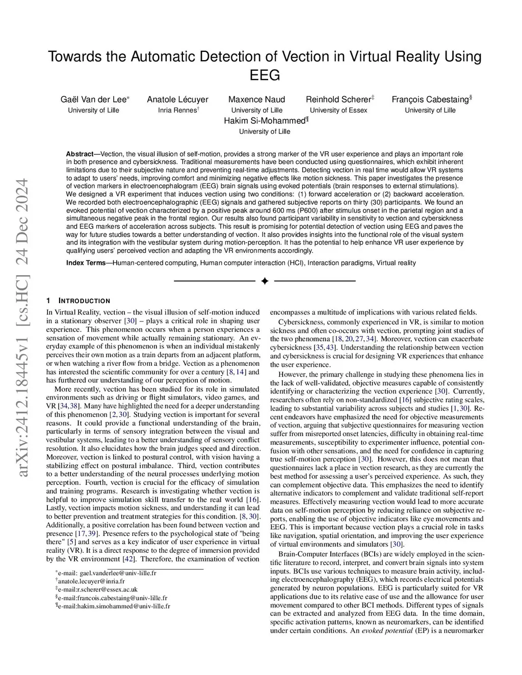 Towards the Automatic Detection of Vection in Virtual Reality Using EEG