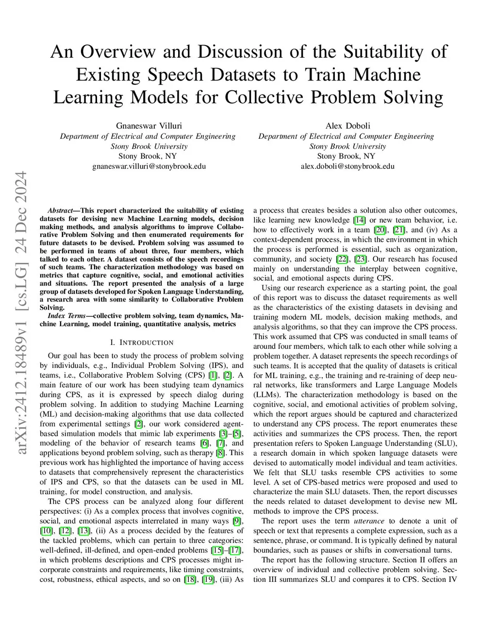 This report characterized the suitability of existing datasets for devising new Machine Learning models, decision making methods, and analysis algorithms to improve Collaborative Problem Solving and then enumerated requirements for future datasets to be devised. Problem solving was assumed to be performed in teams of about three, four members, which talked to each other. A dataset consists of the speech recordings of such teams. The characterization methodology was based on metrics that capture cognitive, social, and emotional activities and situations. The report presented the analysis of a large group of datasets developed for Spoken Language Understanding, a research area with some similarity to Collaborative Problem Solving.