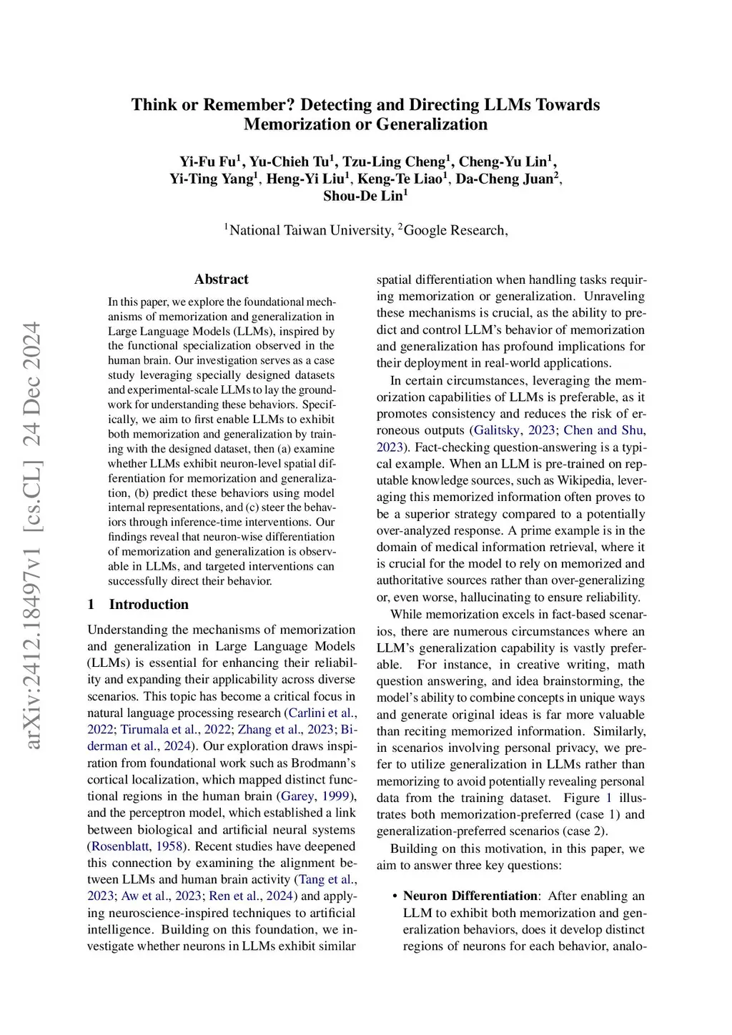 We investigate how Large Language Models (LLMs) distinguish between memorization and generalization at the neuron level. Through carefully designed tasks, we identify distinct neuron subsets responsible for each behavior. Experiments on both a GPT-2 model trained from scratch and a pretrained LLaMA-3.2 model fine-tuned with LoRA show consistent neuron-level specialization. We further demonstrate that inference-time interventions on these neurons can steer the model's behavior toward memorization or generalization. To assess robustness, we evaluate intra-task and inter-task consistency, confirming that these neuron-behavior associations reflect generalizable patterns rather than dataset-specific artifacts. Our findings reveal modular structure in LLMs and enable controlling memorization and generalization behaviors at inference time.