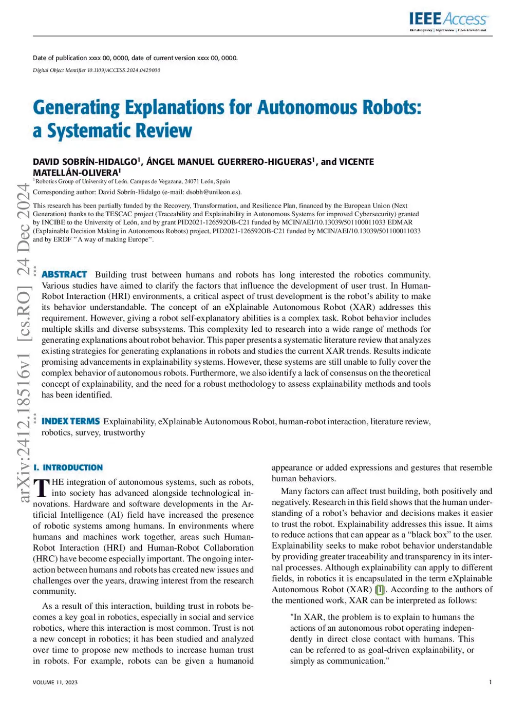 Building trust between humans and robots has long interested the robotics community. Various studies have aimed to clarify the factors that influence the development of user trust. In Human-Robot Interaction (HRI) environments, a critical aspect of trust development is the robot's ability to make its behavior understandable. The concept of an eXplainable Autonomous Robot (XAR) addresses this requirement. However, giving a robot self-explanatory abilities is a complex task. Robot behavior includes multiple skills and diverse subsystems. This complexity led to research into a wide range of methods for generating explanations about robot behavior. This paper presents a systematic literature review that analyzes existing strategies for generating explanations in robots and studies the current XAR trends. Results indicate promising advancements in explainability systems. However, these systems are still unable to fully cover the complex behavior of autonomous robots. Furthermore, we also identify a lack of consensus on the theoretical concept of explainability, and the need for a robust methodology to assess explainability methods and tools has been identified.