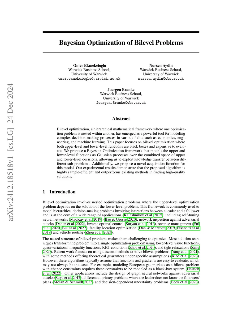 Bilevel optimization, a hierarchical mathematical framework where one optimization problem is nested within another, has emerged as a powerful tool for modeling complex decision-making processes in various fields such as economics, engineering, and machine learning. This paper focuses on bilevel optimization where both upper-level and lower-level functions are black boxes and expensive to evaluate. We propose a Bayesian Optimization framework that models the upper and lower-level functions as Gaussian processes over the combined space of upper and lower-level decisions, allowing us to exploit knowledge transfer between different sub-problems. Additionally, we propose a novel acquisition function for this model. Our experimental results demonstrate that the proposed algorithm is highly sample-efficient and outperforms existing methods in finding high-quality solutions.