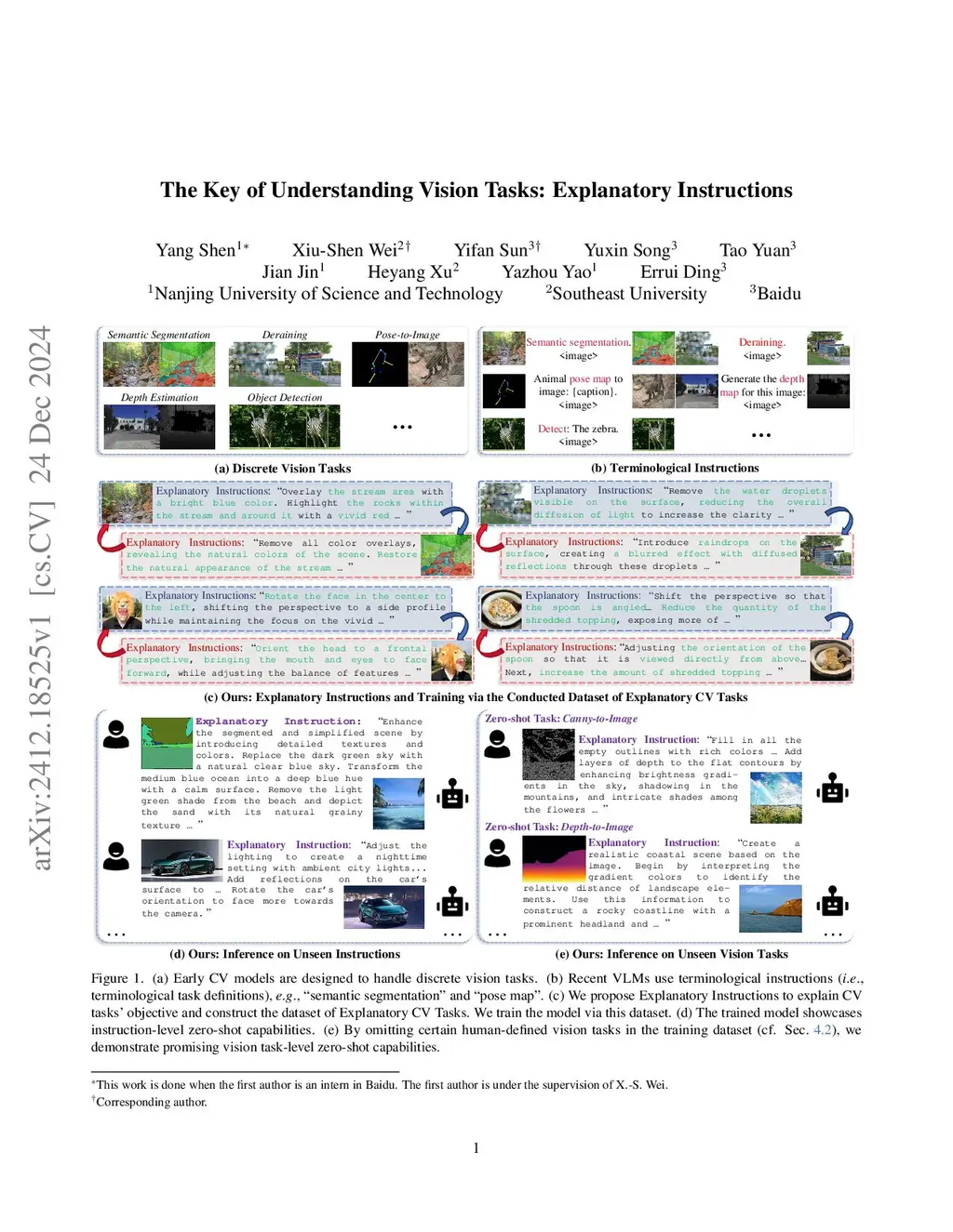 Computer Vision (CV) has yet to fully achieve the zero-shot task generalization observed in Natural Language Processing (NLP), despite following many of the milestones established in NLP, such as large transformer models, extensive pre-training, and the auto-regression paradigm, among others. In this paper, we explore the idea that CV adopts discrete and terminological task definitions (\eg, ``image segmentation''), which may be a key barrier to zero-shot task generalization. Our hypothesis is that without truly understanding previously-seen tasks--due to these terminological definitions--deep models struggle to generalize to novel tasks. To verify this, we introduce Explanatory Instructions, which provide an intuitive way to define CV task objectives through detailed linguistic transformations from input images to outputs. We create a large-scale dataset comprising 12 million ``image input explanatory instruction output'' triplets, and train an auto-regressive-based vision-language model (AR-based VLM) that takes both images and explanatory instructions as input. By learning to follow these instructions, the AR-based VLM achieves instruction-level zero-shot capabilities for previously-seen tasks and demonstrates strong zero-shot generalization for unseen CV tasks. Code and dataset will be openly available on our GitHub repository.