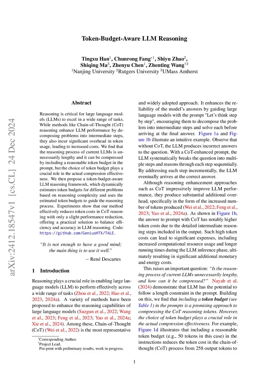 Reasoning is critical for large language models (LLMs) to excel in a wide range of tasks. While methods like Chain-of-Thought (CoT) reasoning and enhance LLM performance by decomposing problems into intermediate steps, they also incur significant overhead in token usage, leading to increased costs. We find that the reasoning process of current LLMs is unnecessarily lengthy and it can be compressed by including a reasonable token budget in the prompt, but the choice of token budget plays a crucial role in the actual compression effectiveness. We then propose a token-budget-aware LLM reasoning framework that dynamically adjusts the number of reasoning tokens based on the reasoning complexity of each problem. Experiments show that our method effectively reduces token costs in CoT reasoning with only a slight performance reduction, offering a practical solution to balance efficiency and accuracy in LLM reasoning. Code:this https URL
