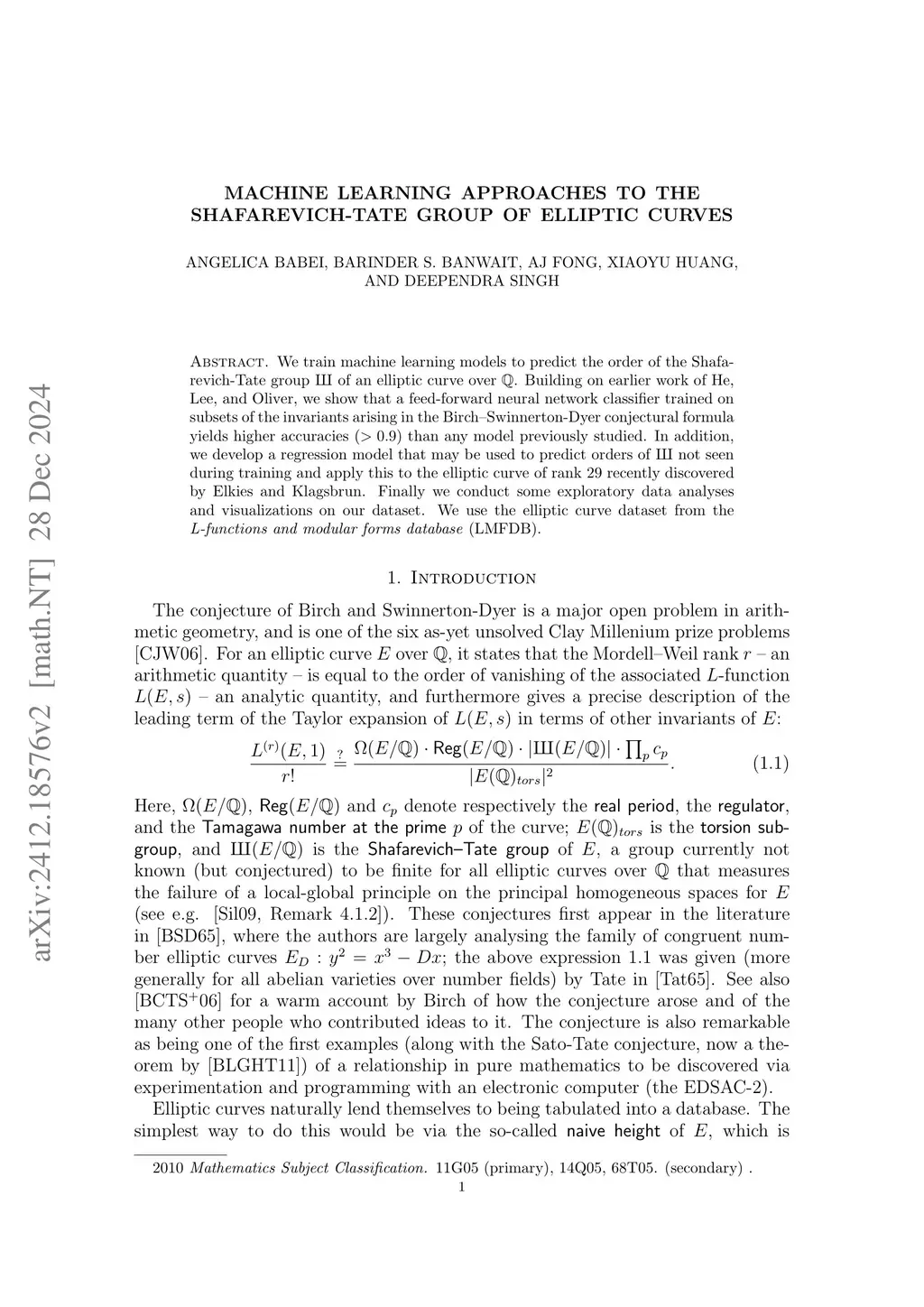 We train machine learning models to predict the order of the Shafarevich-Tate group of an elliptic curve over . Building on earlier work of He, Lee, and Oliver, we show that a feed-forward neural network classifier trained on subsets of the invariants arising in the Birch--Swinnerton-Dyer conjectural formula yields higher accuracies () than any model previously studied. In addition, we develop a regression model that may be used to predict orders of this group not seen during training and apply this to the elliptic curve of rank 29 recently discovered by Elkies and Klagsbrun. Finally we conduct some exploratory data analyses and visualizations on our dataset. We use the elliptic curve dataset from the L-functions and modular forms database (LMFDB).