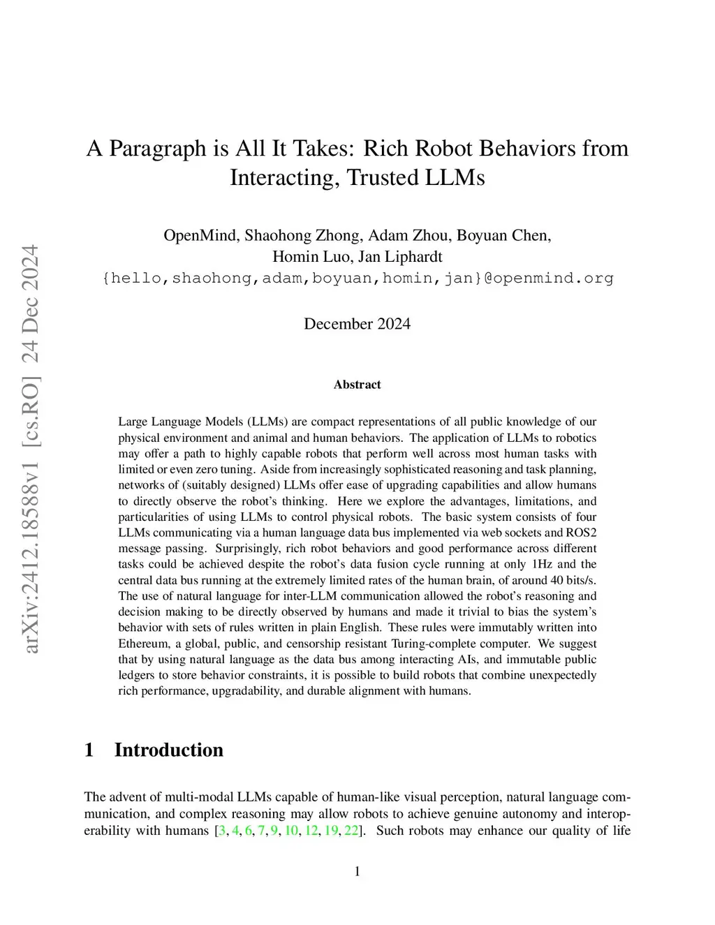 Large Language Models (LLMs) are compact representations of all public knowledge of our physical environment and animal and human behaviors. The application of LLMs to robotics may offer a path to highly capable robots that perform well across most human tasks with limited or even zero tuning. Aside from increasingly sophisticated reasoning and task planning, networks of (suitably designed) LLMs offer ease of upgrading capabilities and allow humans to directly observe the robot's thinking. Here we explore the advantages, limitations, and particularities of using LLMs to control physical robots. The basic system consists of four LLMs communicating via a human language data bus implemented via web sockets and ROS2 message passing. Surprisingly, rich robot behaviors and good performance across different tasks could be achieved despite the robot's data fusion cycle running at only 1Hz and the central data bus running at the extremely limited rates of the human brain, of around 40 bits/s. The use of natural language for inter-LLM communication allowed the robot's reasoning and decision making to be directly observed by humans and made it trivial to bias the system's behavior with sets of rules written in plain English. These rules were immutably written into Ethereum, a global, public, and censorship resistant Turing-complete computer. We suggest that by using natural language as the data bus among interacting AIs, and immutable public ledgers to store behavior constraints, it is possible to build robots that combine unexpectedly rich performance, upgradability, and durable alignment with humans.