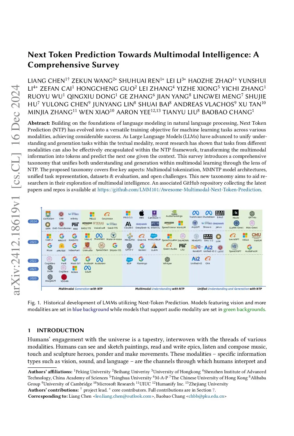 Building on the foundations of language modeling in natural language processing, Next Token Prediction (NTP) has evolved into a versatile training objective for machine learning tasks across various modalities, achieving considerable success. As Large Language Models (LLMs) have advanced to unify understanding and generation tasks within the textual modality, recent research has shown that tasks from different modalities can also be effectively encapsulated within the NTP framework, transforming the multimodal information into tokens and predict the next one given the context. This survey introduces a comprehensive taxonomy that unifies both understanding and generation within multimodal learning through the lens of NTP. The proposed taxonomy covers five key aspects: Multimodal tokenization, MMNTP model architectures, unified task representation, datasets \& evaluation, and open challenges. This new taxonomy aims to aid researchers in their exploration of multimodal intelligence. An associated GitHub repository collecting the latest papers and repos is available atthis https URL