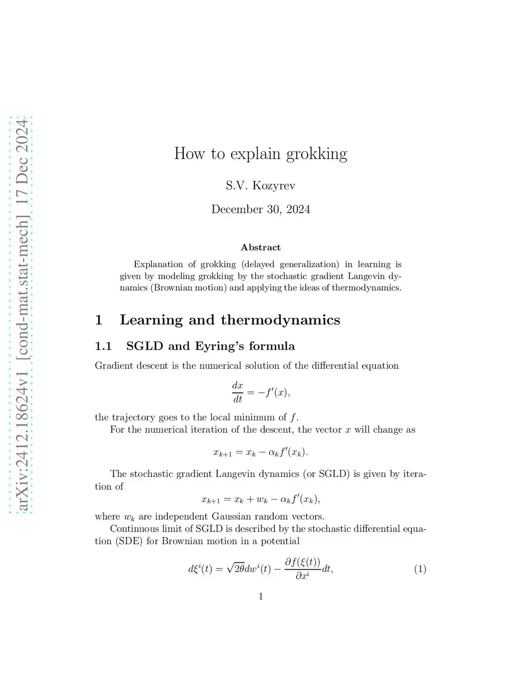 Explanation of grokking (delayed generalization) in learning is given by modeling grokking by the stochastic gradient Langevin dynamics (Brownian motion) and applying the ideas of thermodynamics.