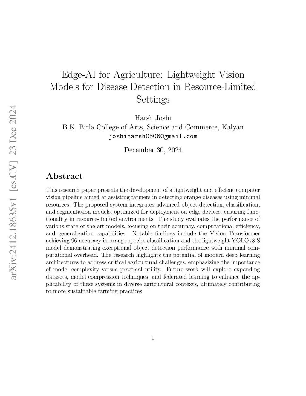 This research paper presents the development of a lightweight and efficient computer vision pipeline aimed at assisting farmers in detecting orange diseases using minimal resources. The proposed system integrates advanced object detection, classification, and segmentation models, optimized for deployment on edge devices, ensuring functionality in resource-limited environments. The study evaluates the performance of various state-of-the-art models, focusing on their accuracy, computational efficiency, and generalization capabilities. Notable findings include the Vision Transformer achieving 96 accuracy in orange species classification and the lightweight YOLOv8-S model demonstrating exceptional object detection performance with minimal computational overhead. The research highlights the potential of modern deep learning architectures to address critical agricultural challenges, emphasizing the importance of model complexity versus practical utility. Future work will explore expanding datasets, model compression techniques, and federated learning to enhance the applicability of these systems in diverse agricultural contexts, ultimately contributing to more sustainable farming practices.