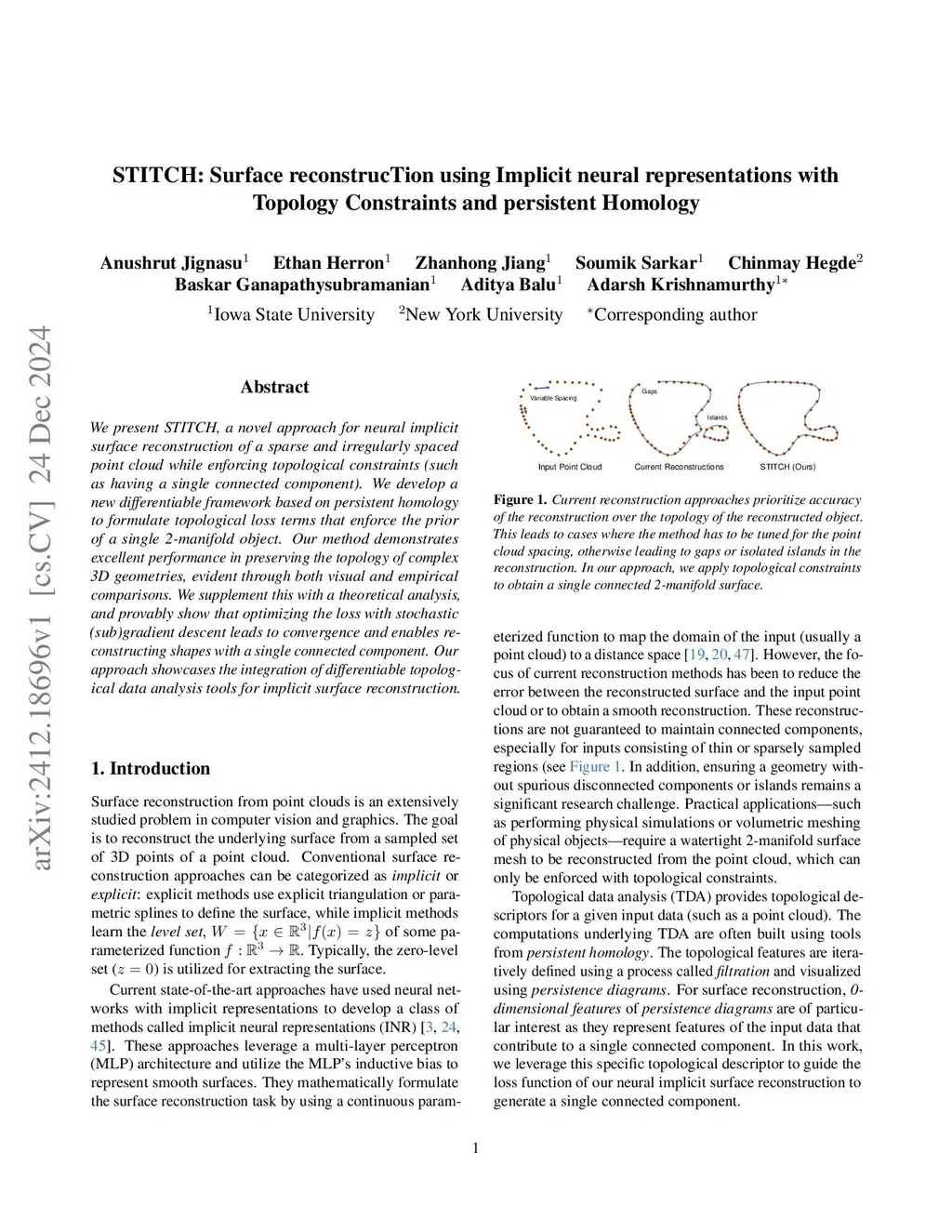 We present STITCH, a novel approach for neural implicit surface reconstruction of a sparse and irregularly spaced point cloud while enforcing topological constraints (such as having a single connected component). We develop a new differentiable framework based on persistent homology to formulate topological loss terms that enforce the prior of a single 2-manifold object. Our method demonstrates excellent performance in preserving the topology of complex 3D geometries, evident through both visual and empirical comparisons. We supplement this with a theoretical analysis, and provably show that optimizing the loss with stochastic (sub)gradient descent leads to convergence and enables reconstructing shapes with a single connected component. Our approach showcases the integration of differentiable topological data analysis tools for implicit surface reconstruction.
