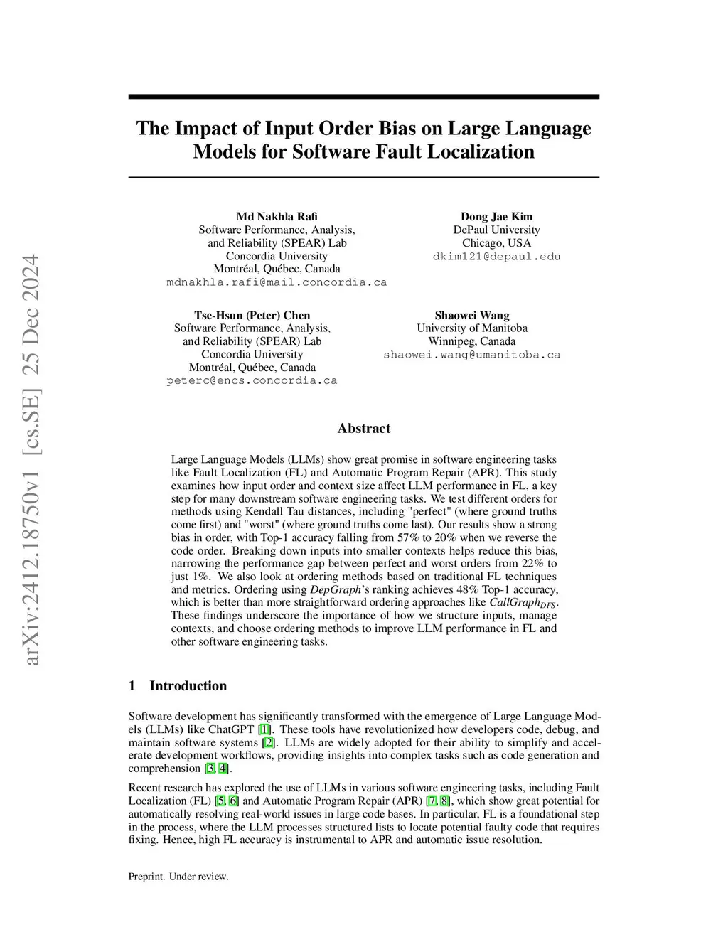 Large Language Models (LLMs) show great promise in software engineering tasks like Fault Localization (FL) and Automatic Program Repair (APR). This study investigates the impact of input order and context size on LLM performance in FL, a crucial step for many downstream software engineering tasks. We test different orders for methods using Kendall Tau distances, including "perfect" (where ground truths come first) and "worst" (where ground truths come last), using two benchmarks that consist of both Java and Python projects. Our results indicate a significant bias in order; Top-1 FL accuracy in Java projects drops from 57% to 20%, while in Python projects, it decreases from 38% to approximately 3% when we reverse the code order. Breaking down inputs into smaller contexts helps reduce this bias, narrowing the performance gap in FL from 22% to 6% and then to just 1% on both benchmarks. We then investigated whether the bias in order was caused by data leakage by renaming the method names with more meaningful alternatives. Our findings indicated that the trend remained consistent, suggesting that the bias was not due to data leakage. We also look at ordering methods based on traditional FL techniques and metrics. Ordering using DepGraph's ranking achieves 48% Top-1 accuracy, which is better than more straightforward ordering approaches like CallGraphDFS. These findings underscore the importance of how we structure inputs, manage contexts, and choose ordering methods to improve LLM performance in FL and other software engineering tasks.