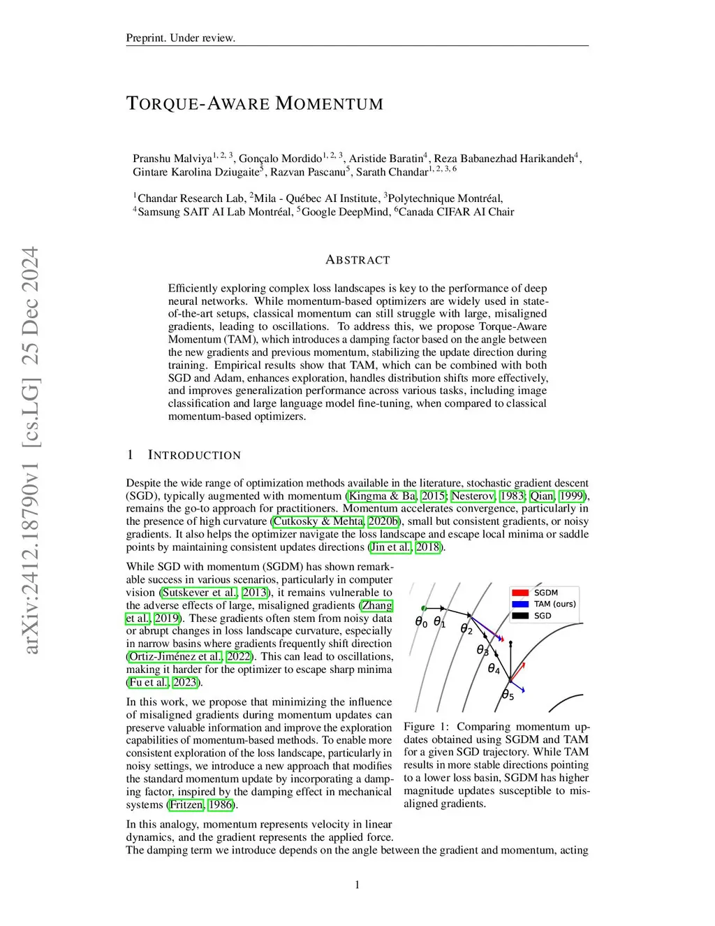 Efficiently exploring complex loss landscapes is key to the performance of deep neural networks. While momentum-based optimizers are widely used in state-of-the-art setups, classical momentum can still struggle with large, misaligned gradients, leading to oscillations. To address this, we propose Torque-Aware Momentum (TAM), which introduces a damping factor based on the angle between the new gradients and previous momentum, stabilizing the update direction during training. Empirical results show that TAM, which can be combined with both SGD and Adam, enhances exploration, handles distribution shifts more effectively, and improves generalization performance across various tasks, including image classification and large language model fine-tuning, when compared to classical momentum-based optimizers.