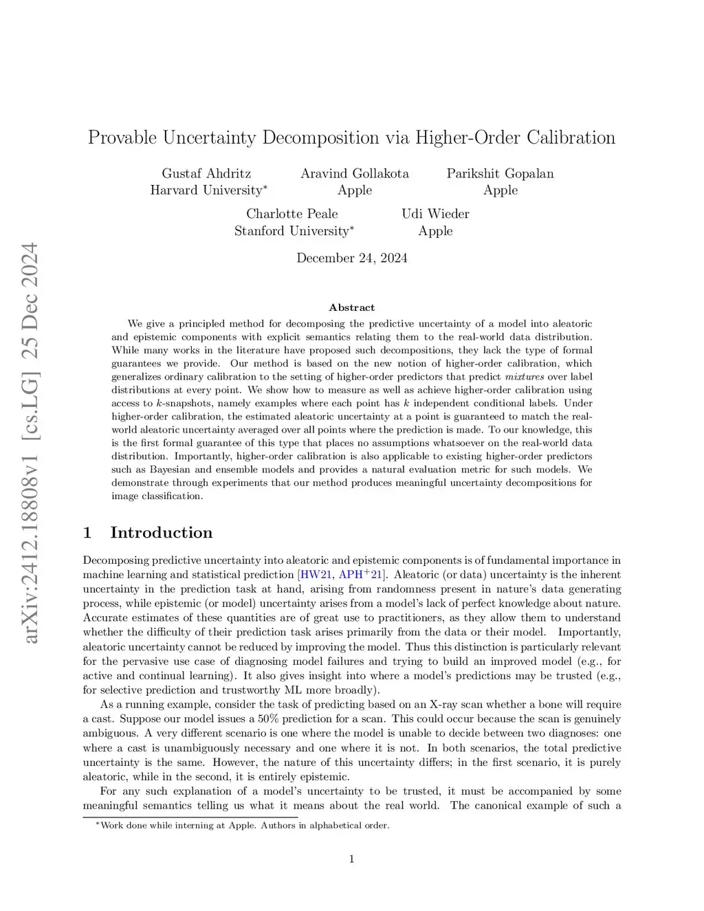 We give a principled method for decomposing the predictive uncertainty of a model into aleatoric and epistemic components with explicit semantics relating them to the real-world data distribution. While many works in the literature have proposed such decompositions, they lack the type of formal guarantees we provide. Our method is based on the new notion of higher-order calibration, which generalizes ordinary calibration to the setting of higher-order predictors that predict mixtures over label distributions at every point. We show how to measure as well as achieve higher-order calibration using access to -snapshots, namely examples where each point has independent conditional labels. Under higher-order calibration, the estimated aleatoric uncertainty at a point is guaranteed to match the real-world aleatoric uncertainty averaged over all points where the prediction is made. To our knowledge, this is the first formal guarantee of this type that places no assumptions whatsoever on the real-world data distribution. Importantly, higher-order calibration is also applicable to existing higher-order predictors such as Bayesian and ensemble models and provides a natural evaluation metric for such models. We demonstrate through experiments that our method produces meaningful uncertainty decompositions for image classification.