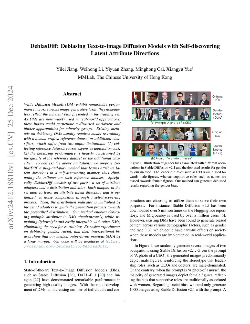 While Diffusion Models (DM) exhibit remarkable performance across various image generative tasks, they nonetheless reflect the inherent bias presented in the training set. As DMs are now widely used in real-world applications, these biases could perpetuate a distorted worldview and hinder opportunities for minority groups. Existing methods on debiasing DMs usually requires model retraining with a human-crafted reference dataset or additional classifiers, which suffer from two major limitations: (1) collecting reference datasets causes expensive annotation cost; (2) the debiasing performance is heavily constrained by the quality of the reference dataset or the additional classifier. To address the above limitations, we propose FairGen, a plug-and-play method that learns attribute latent directions in a self-discovering manner, thus eliminating the reliance on such reference dataset. Specifically, FairGen consists of two parts: a set of attribute adapters and a distribution indicator. Each adapter in the set aims to learn an attribute latent direction, and is optimized via noise composition through a self-discovering process. Then, the distribution indicator is multiplied by the set of adapters to guide the generation process towards the prescribed distribution. Our method enables debiasing multiple attributes in DMs simultaneously, while remaining lightweight and easily integrable with other DMs, eliminating the need for retraining. Extensive experiments on debiasing gender, racial, and their intersectional biases show that our method outperforms previous SOTA by a large margin.