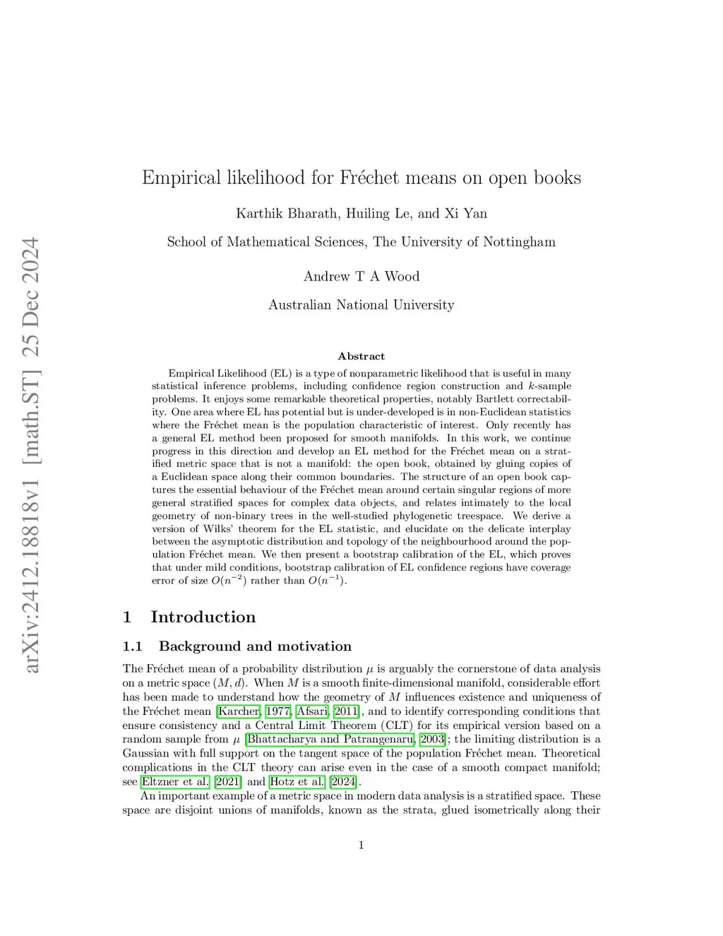 Empirical Likelihood (EL) is a type of nonparametric likelihood that is useful in many statistical inference problems, including confidence region construction and -sample problems. It enjoys some remarkable theoretical properties, notably Bartlett correctability. One area where EL has potential but is under-developed is in non-Euclidean statistics where the Fr\échet mean is the population characteristic of interest. Only recently has a general EL method been proposed for smooth manifolds. In this work, we continue progress in this direction and develop an EL method for the Fr\échet mean on a stratified metric space that is not a manifold: the open book, obtained by gluing copies of a Euclidean space along their common boundaries. The structure of an open book captures the essential behaviour of the Fr\échet mean around certain singular regions of more general stratified spaces for complex data objects, and relates intimately to the local geometry of non-binary trees in the well-studied phylogenetic treespace. We derive a version of Wilks' theorem for the EL statistic, and elucidate on the delicate interplay between the asymptotic distribution and topology of the neighbourhood around the population Fr\échet mean. We then present a bootstrap calibration of the EL, which proves that under mild conditions, bootstrap calibration of EL confidence regions have coverage error of size rather than .