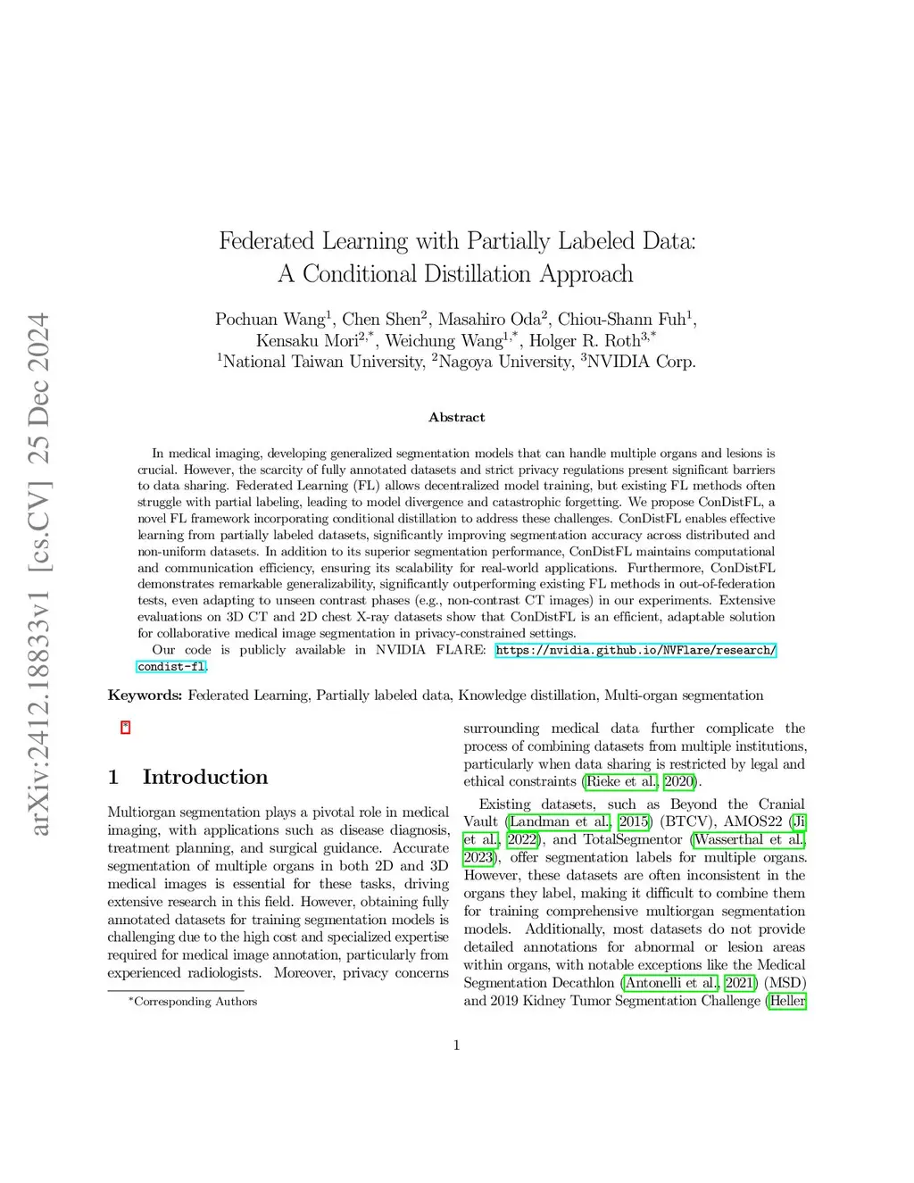 In medical imaging, developing generalized segmentation models that can handle multiple organs and lesions is crucial. However, the scarcity of fully annotated datasets and strict privacy regulations present significant barriers to data sharing. Federated Learning (FL) allows decentralized model training, but existing FL methods often struggle with partial labeling, leading to model divergence and catastrophic forgetting. We propose ConDistFL, a novel FL framework incorporating conditional distillation to address these challenges. ConDistFL enables effective learning from partially labeled datasets, significantly improving segmentation accuracy across distributed and non-uniform datasets. In addition to its superior segmentation performance, ConDistFL maintains computational and communication efficiency, ensuring its scalability for real-world applications. Furthermore, ConDistFL demonstrates remarkable generalizability, significantly outperforming existing FL methods in out-of-federation tests, even adapting to unseen contrast phases (e.g., non-contrast CT images) in our experiments. Extensive evaluations on 3D CT and 2D chest X-ray datasets show that ConDistFL is an efficient, adaptable solution for collaborative medical image segmentation in privacy-constrained settings.