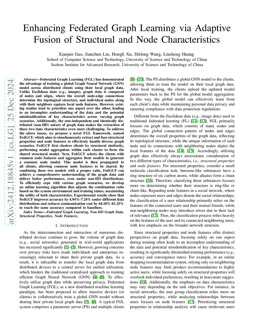 Federated Graph Learning (FGL) has demonstrated the advantage of training a global Graph Neural Network (GNN) model across distributed clients using their local graph data. Unlike Euclidean data (\eg, images), graph data is composed of nodes and edges, where the overall node-edge connections determine the topological structure, and individual nodes along with their neighbors capture local node features. However, existing studies tend to prioritize one aspect over the other, leading to an incomplete understanding of the data and the potential misidentification of key characteristics across varying graph scenarios. Additionally, the non-independent and identically distributed (non-IID) nature of graph data makes the extraction of these two data characteristics even more challenging. To address the above issues, we propose a novel FGL framework, named FedGCF, which aims to simultaneously extract and fuse structural properties and node features to effectively handle diverse graph scenarios. FedGCF first clusters clients by structural similarity, performing model aggregation within each cluster to form the shared structural model. Next, FedGCF selects the clients with common node features and aggregates their models to generate a common node model. This model is then propagated to all clients, allowing common node features to be shared. By combining these two models with a proper ratio, FedGCF can achieve a comprehensive understanding of the graph data and deliver better performance, even under non-IID distributions. Experimental results show that FedGCF improves accuracy by 4.94%-7.24% under different data distributions and reduces communication cost by 64.18%-81.25% to reach the same accuracy compared to baselines.