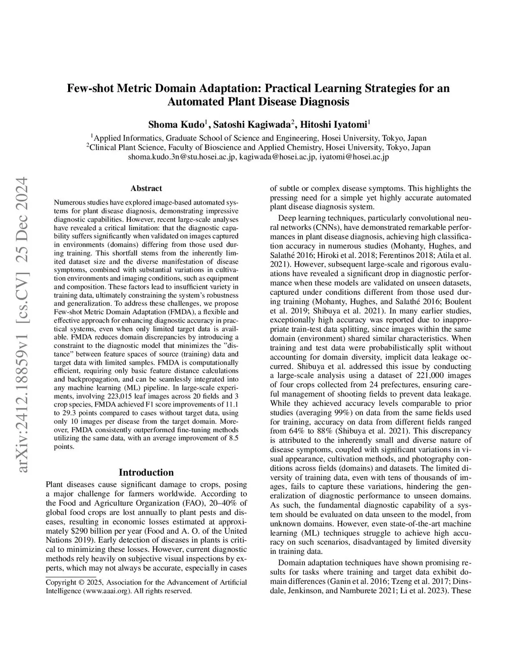 Numerous studies have explored image-based automated systems for plant disease diagnosis, demonstrating impressive diagnostic capabilities. However, recent large-scale analyses have revealed a critical limitation: that the diagnostic capability suffers significantly when validated on images captured in environments (domains) differing from those used during training. This shortfall stems from the inherently limited dataset size and the diverse manifestation of disease symptoms, combined with substantial variations in cultivation environments and imaging conditions, such as equipment and composition. These factors lead to insufficient variety in training data, ultimately constraining the system's robustness and generalization. To address these challenges, we propose Few-shot Metric Domain Adaptation (FMDA), a flexible and effective approach for enhancing diagnostic accuracy in practical systems, even when only limited target data is available. FMDA reduces domain discrepancies by introducing a constraint to the diagnostic model that minimizes the "distance" between feature spaces of source (training) data and target data with limited samples. FMDA is computationally efficient, requiring only basic feature distance calculations and backpropagation, and can be seamlessly integrated into any machine learning (ML) pipeline. In large-scale experiments, involving 223,015 leaf images across 20 fields and 3 crop species, FMDA achieved F1 score improvements of 11.1 to 29.3 points compared to cases without target data, using only 10 images per disease from the target domain. Moreover, FMDA consistently outperformed fine-tuning methods utilizing the same data, with an average improvement of 8.5 points.