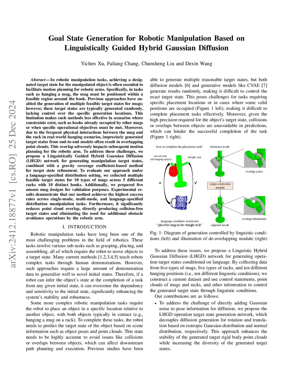 In robotic manipulation tasks, achieving a designated target state for the manipulated object is often essential to facilitate motion planning for robotic arms. Specifically, in tasks such as hanging a mug, the mug must be positioned within a feasible region around the hook. Previous approaches have enabled the generation of multiple feasible target states for mugs; however, these target states are typically generated randomly, lacking control over the specific generation locations. This limitation makes such methods less effective in scenarios where constraints exist, such as hooks already occupied by other mugs or when specific operational objectives must be met. Moreover, due to the frequent physical interactions between the mug and the rack in real-world hanging scenarios, imprecisely generated target states from end-to-end models often result in overlapping point clouds. This overlap adversely impacts subsequent motion planning for the robotic arm. To address these challenges, we propose a Linguistically Guided Hybrid Gaussian Diffusion (LHGD) network for generating manipulation target states, combined with a gravity coverage coefficient-based method for target state refinement. To evaluate our approach under a language-specified distribution setting, we collected multiple feasible target states for 10 types of mugs across 5 different racks with 10 distinct hooks. Additionally, we prepared five unseen mug designs for validation purposes. Experimental results demonstrate that our method achieves the highest success rates across single-mode, multi-mode, and language-specified distribution manipulation tasks. Furthermore, it significantly reduces point cloud overlap, directly producing collision-free target states and eliminating the need for additional obstacle avoidance operations by the robotic arm.