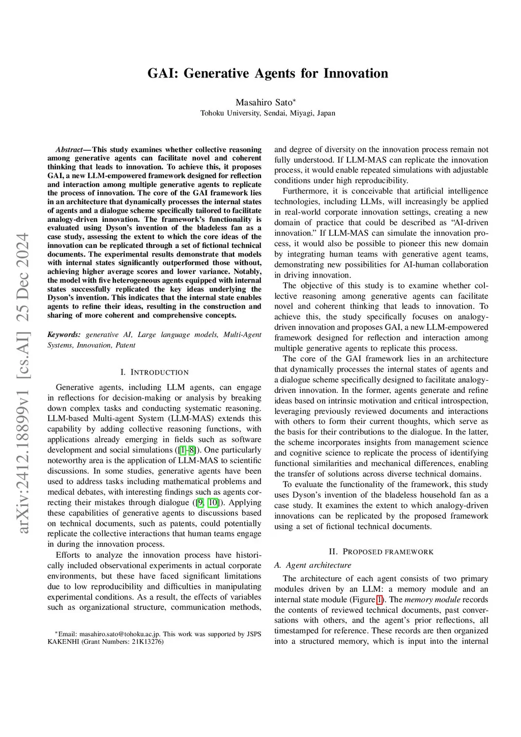 This study examines whether collective reasoning among generative agents can facilitate novel and coherent thinking that leads to innovation. To achieve this, it proposes GAI, a new LLM-empowered framework designed for reflection and interaction among multiple generative agents to replicate the process of innovation. The core of the GAI framework lies in an architecture that dynamically processes the internal states of agents and a dialogue scheme specifically tailored to facilitate analogy-driven innovation. The framework's functionality is evaluated using Dyson's invention of the bladeless fan as a case study, assessing the extent to which the core ideas of the innovation can be replicated through a set of fictional technical documents. The experimental results demonstrate that models with internal states significantly outperformed those without, achieving higher average scores and lower variance. Notably, the model with five heterogeneous agents equipped with internal states successfully replicated the key ideas underlying the Dyson's invention. This indicates that the internal state enables agents to refine their ideas, resulting in the construction and sharing of more coherent and comprehensive concepts.