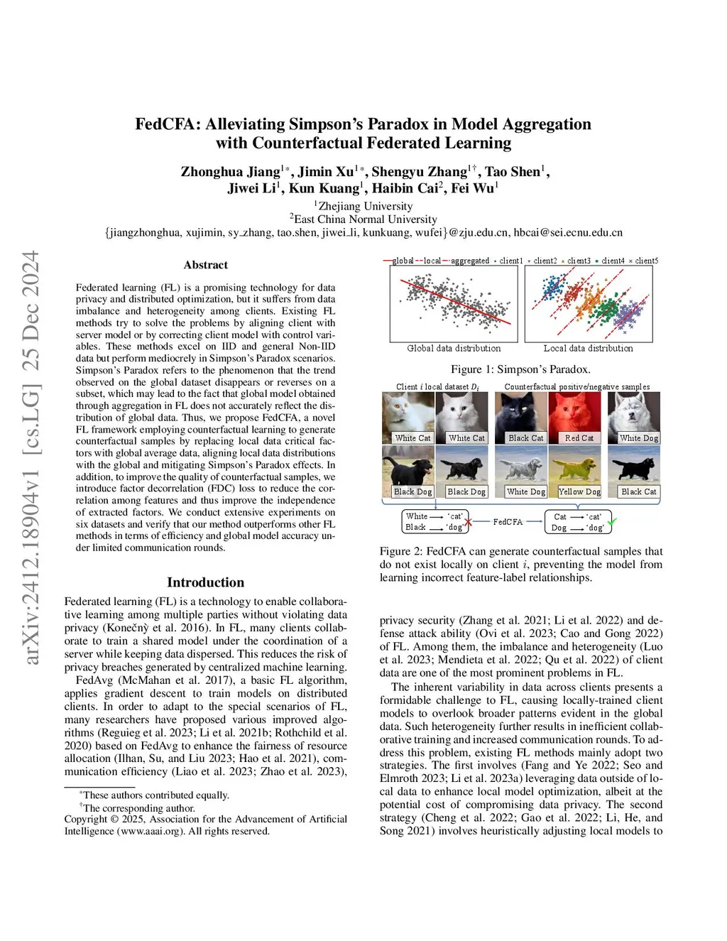 Federated learning (FL) is a promising technology for data privacy and distributed optimization, but it suffers from data imbalance and heterogeneity among clients. Existing FL methods try to solve the problems by aligning client with server model or by correcting client model with control variables. These methods excel on IID and general Non-IID data but perform mediocrely in Simpson's Paradox scenarios. Simpson's Paradox refers to the phenomenon that the trend observed on the global dataset disappears or reverses on a subset, which may lead to the fact that global model obtained through aggregation in FL does not accurately reflect the distribution of global data. Thus, we propose FedCFA, a novel FL framework employing counterfactual learning to generate counterfactual samples by replacing local data critical factors with global average data, aligning local data distributions with the global and mitigating Simpson's Paradox effects. In addition, to improve the quality of counterfactual samples, we introduce factor decorrelation (FDC) loss to reduce the correlation among features and thus improve the independence of extracted factors. We conduct extensive experiments on six datasets and verify that our method outperforms other FL methods in terms of efficiency and global model accuracy under limited communication rounds.