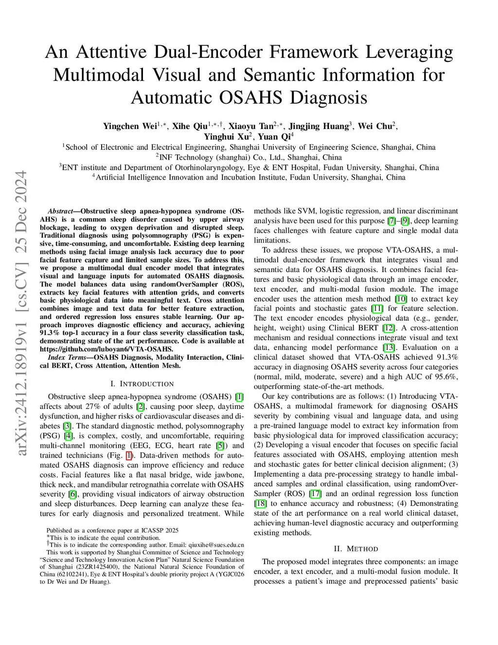 Obstructive sleep apnea-hypopnea syndrome (OSAHS) is a common sleep disorder caused by upper airway blockage, leading to oxygen deprivation and disrupted sleep. Traditional diagnosis using polysomnography (PSG) is expensive, time-consuming, and uncomfortable. Existing deep learning methods using facial image analysis lack accuracy due to poor facial feature capture and limited sample sizes. To address this, we propose a multimodal dual encoder model that integrates visual and language inputs for automated OSAHS diagnosis. The model balances data using randomOverSampler, extracts key facial features with attention grids, and converts physiological data into meaningful text. Cross-attention combines image and text data for better feature extraction, and ordered regression loss ensures stable learning. Our approach improves diagnostic efficiency and accuracy, achieving 91.3% top-1 accuracy in a four-class severity classification task, demonstrating state-of-the-art performance. Code will be released upon acceptance.