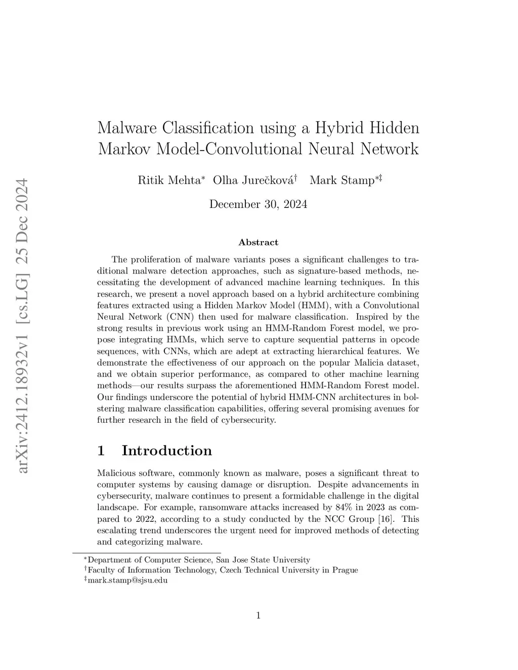 Malware Classification using a Hybrid Hidden Markov Model-Convolutional