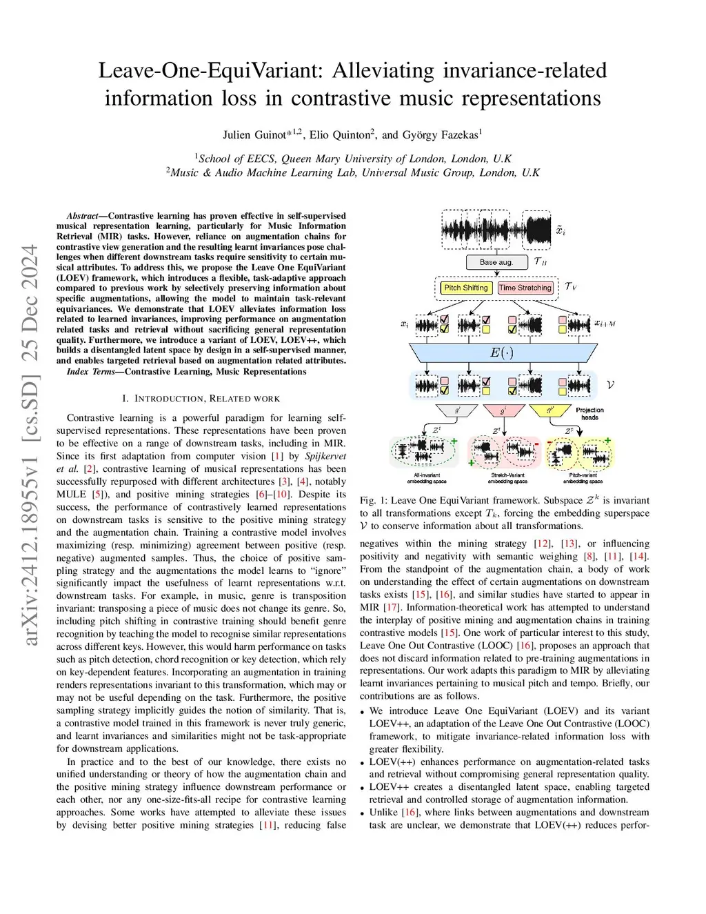 Contrastive learning has proven effective in self-supervised musical representation learning, particularly for Music Information Retrieval (MIR) tasks. However, reliance on augmentation chains for contrastive view generation and the resulting learnt invariances pose challenges when different downstream tasks require sensitivity to certain musical attributes. To address this, we propose the Leave One EquiVariant (LOEV) framework, which introduces a flexible, task-adaptive approach compared to previous work by selectively preserving information about specific augmentations, allowing the model to maintain task-relevant equivariances. We demonstrate that LOEV alleviates information loss related to learned invariances, improving performance on augmentation related tasks and retrieval without sacrificing general representation quality. Furthermore, we introduce a variant of LOEV, LOEV++, which builds a disentangled latent space by design in a self-supervised manner, and enables targeted retrieval based on augmentation related attributes.