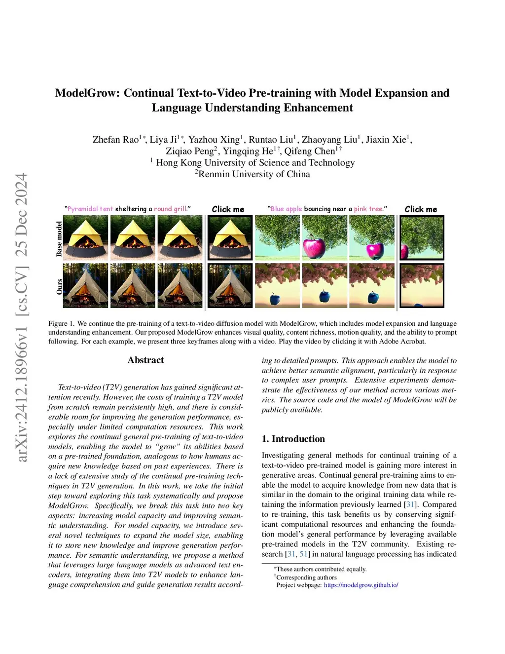 ModelGrow: Continual Text-to-Video Pre-training with Model Expansion and