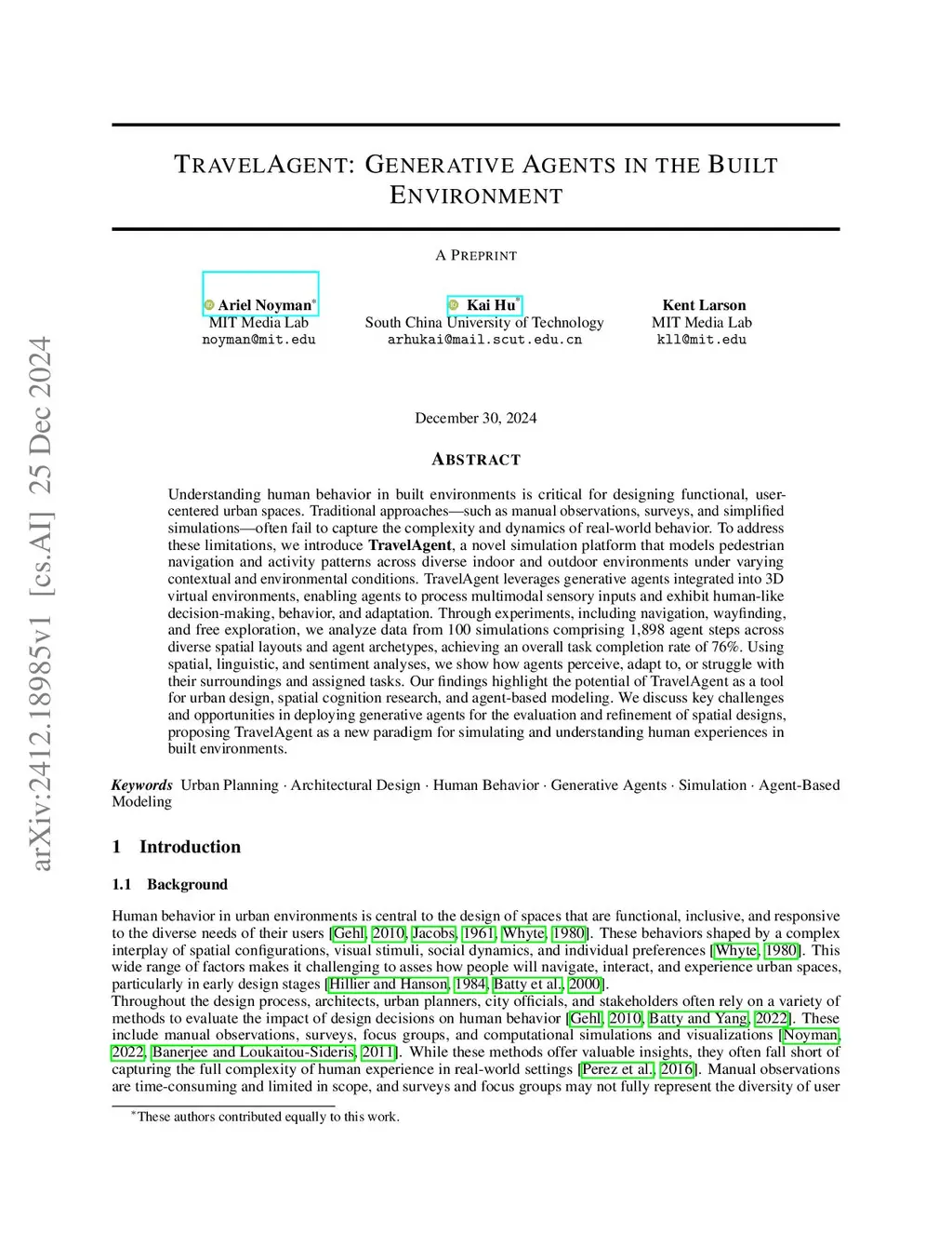 Understanding human behavior in built environments is critical for designing functional, user centered urban spaces. Traditional approaches, such as manual observations, surveys, and simplified simulations, often fail to capture the complexity and dynamics of real world behavior. To address these limitations, we introduce TravelAgent, a novel simulation platform that models pedestrian navigation and activity patterns across diverse indoor and outdoor environments under varying contextual and environmental conditions. TravelAgent leverages generative agents integrated into 3D virtual environments, enabling agents to process multimodal sensory inputs and exhibit human-like decision-making, behavior, and adaptation. Through experiments, including navigation, wayfinding, and free exploration, we analyze data from 100 simulations comprising 1898 agent steps across diverse spatial layouts and agent archetypes, achieving an overall task completion rate of 76%. Using spatial, linguistic, and sentiment analyses, we show how agents perceive, adapt to, or struggle with their surroundings and assigned tasks. Our findings highlight the potential of TravelAgent as a tool for urban design, spatial cognition research, and agent-based modeling. We discuss key challenges and opportunities in deploying generative agents for the evaluation and refinement of spatial designs, proposing TravelAgent as a new paradigm for simulating and understanding human experiences in built environments.