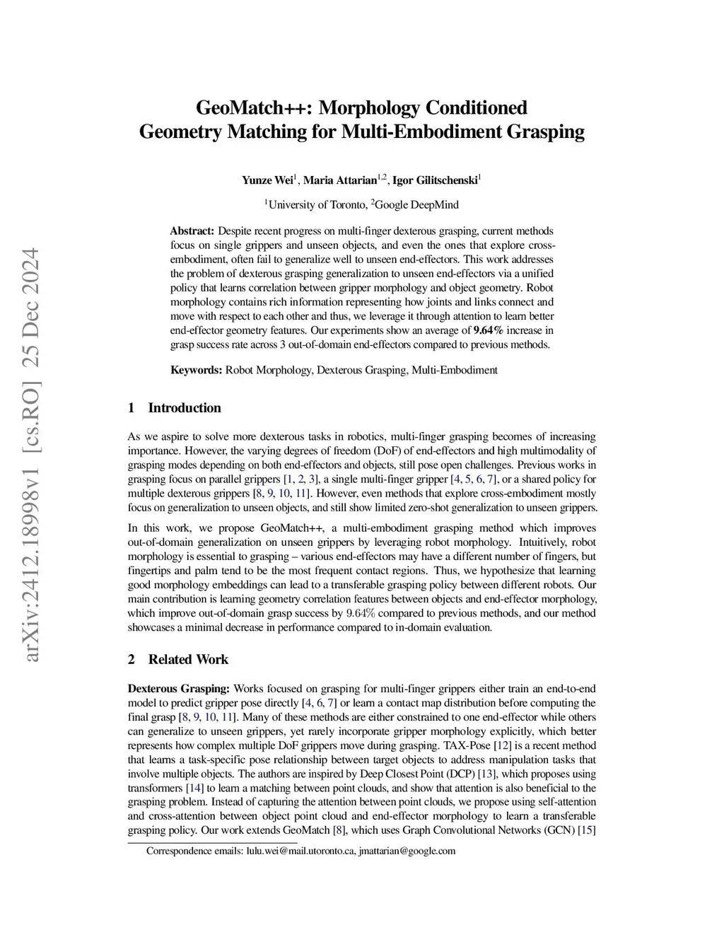 Despite recent progress on multi-finger dexterous grasping, current methods focus on single grippers and unseen objects, and even the ones that explore cross-embodiment, often fail to generalize well to unseen end-effectors. This work addresses the problem of dexterous grasping generalization to unseen end-effectors via a unified policy that learns correlation between gripper morphology and object geometry. Robot morphology contains rich information representing how joints and links connect and move with respect to each other and thus, we leverage it through attention to learn better end-effector geometry features. Our experiments show an average of 9.64% increase in grasp success rate across 3 out-of-domain end-effectors compared to previous methods.