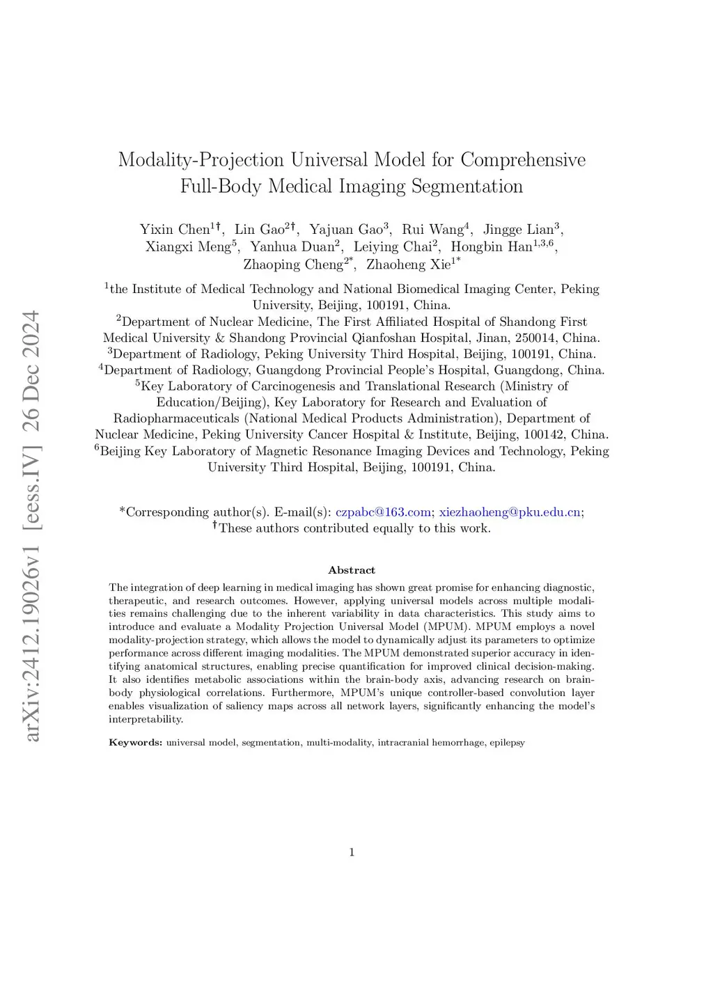 The integration of deep learning in medical imaging has shown great promise for enhancing diagnostic, therapeutic, and research outcomes. However, applying universal models across multiple modalities remains challenging due to the inherent variability in data characteristics. This study aims to introduce and evaluate a Modality Projection Universal Model (MPUM). MPUM employs a novel modality-projection strategy, which allows the model to dynamically adjust its parameters to optimize performance across different imaging modalities. The MPUM demonstrated superior accuracy in identifying anatomical structures, enabling precise quantification for improved clinical decision-making. It also identifies metabolic associations within the brain-body axis, advancing research on brain-body physiological correlations. Furthermore, MPUM's unique controller-based convolution layer enables visualization of saliency maps across all network layers, significantly enhancing the model's interpretability.